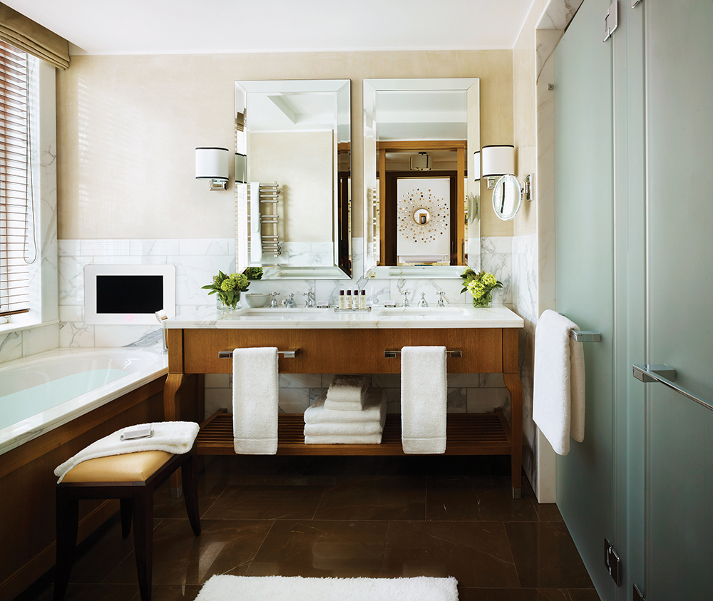 Designer Martin Goddard selected Perrin & Rowe as partner for all 294 guest rooms and suites. On major hotel and residential projects, our specialist team can work with a designer to develop unique products to suit a particular design style. In this case, a bespoke version of our Traditional brassware was produced complements the lavish Italian marble en-suites.