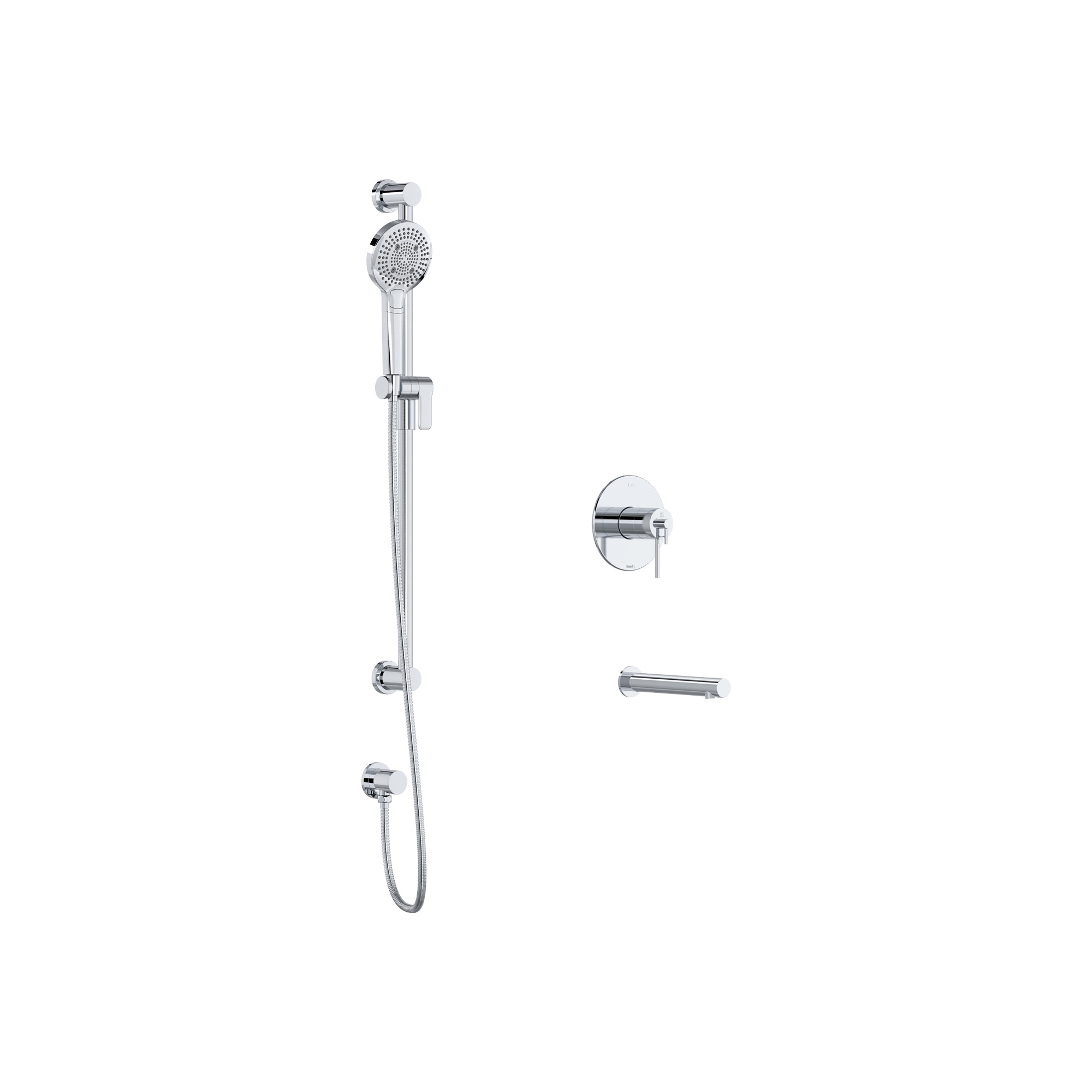 Kit includes all components to create the perfect shower: rough, trim, multi-function hand shower and rail, bath spout.