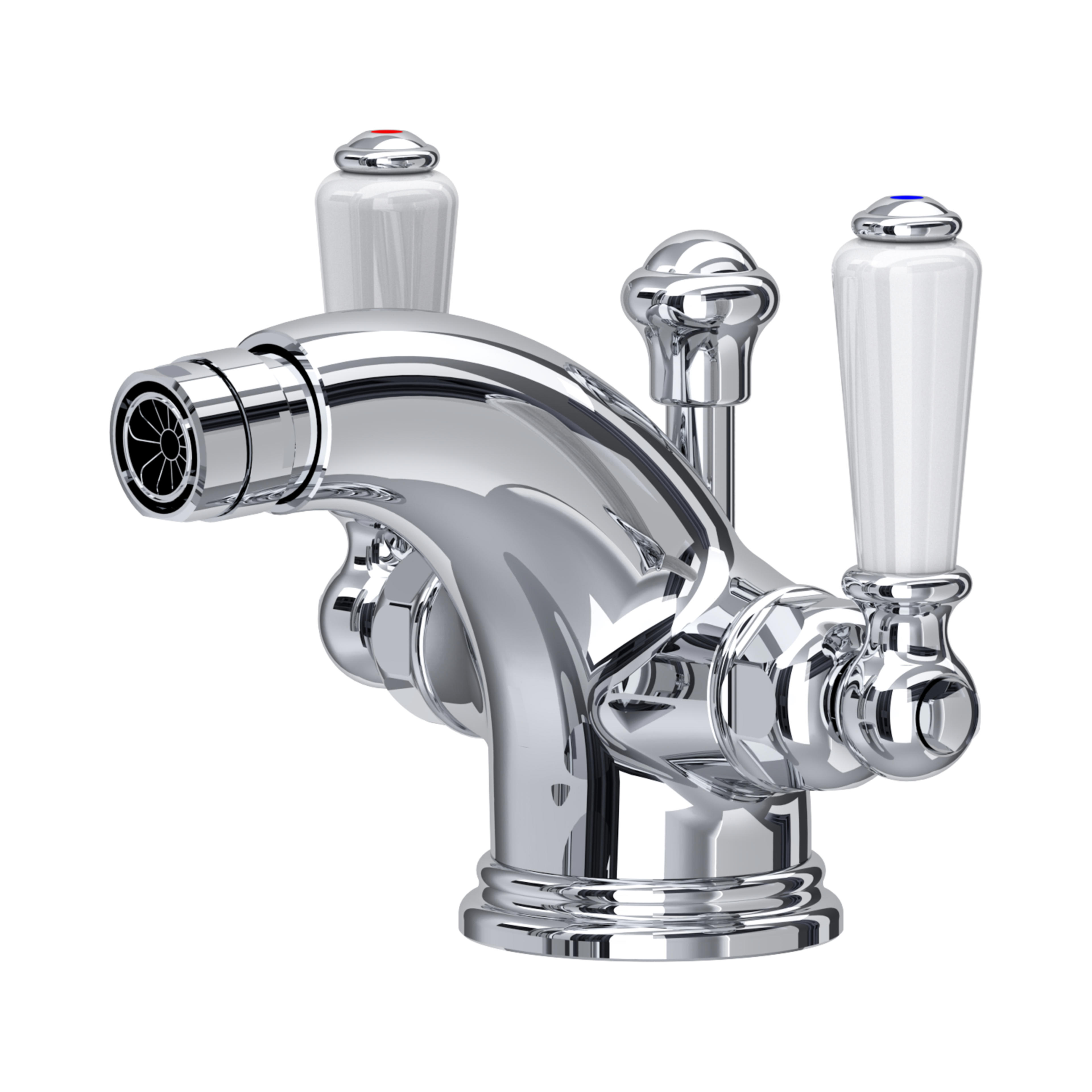 This classically-styled Traditional bidet mixer features elegant detailing and beautiful porcelain inserts on the lever handles. Supplied with a pop-up waste.
