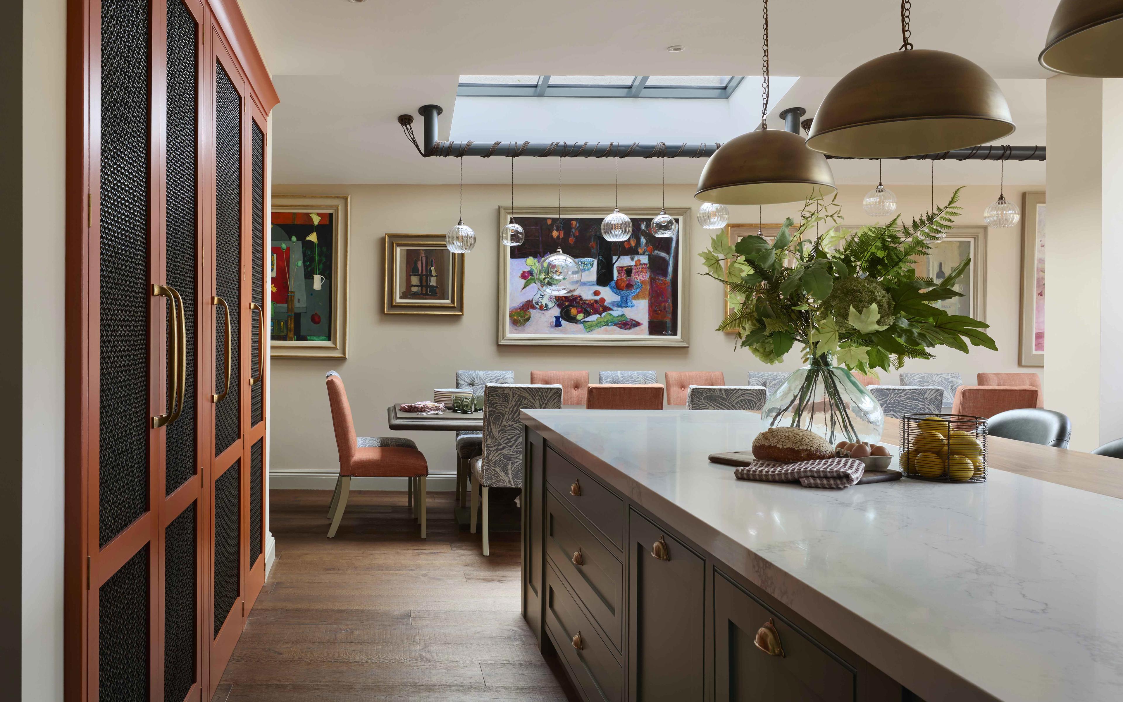 Tess’ clients were keen to create a kitchen space that was open, inviting and social. An area of the home in which to predominantly host, hold events and throw dinners. The client loves to socialise and therefore wanted their new kitchen to feel seamlessly connected with the dining space and the open plan living area. Tess decided to create a space that despite being large enough to fit a table to sit 20 people, still felt warm and homely. The clever use of soft furnishings and traditional materials, like wood, stop the space from feeling too vast by dampening the sound, and softening the whole feel of the room.