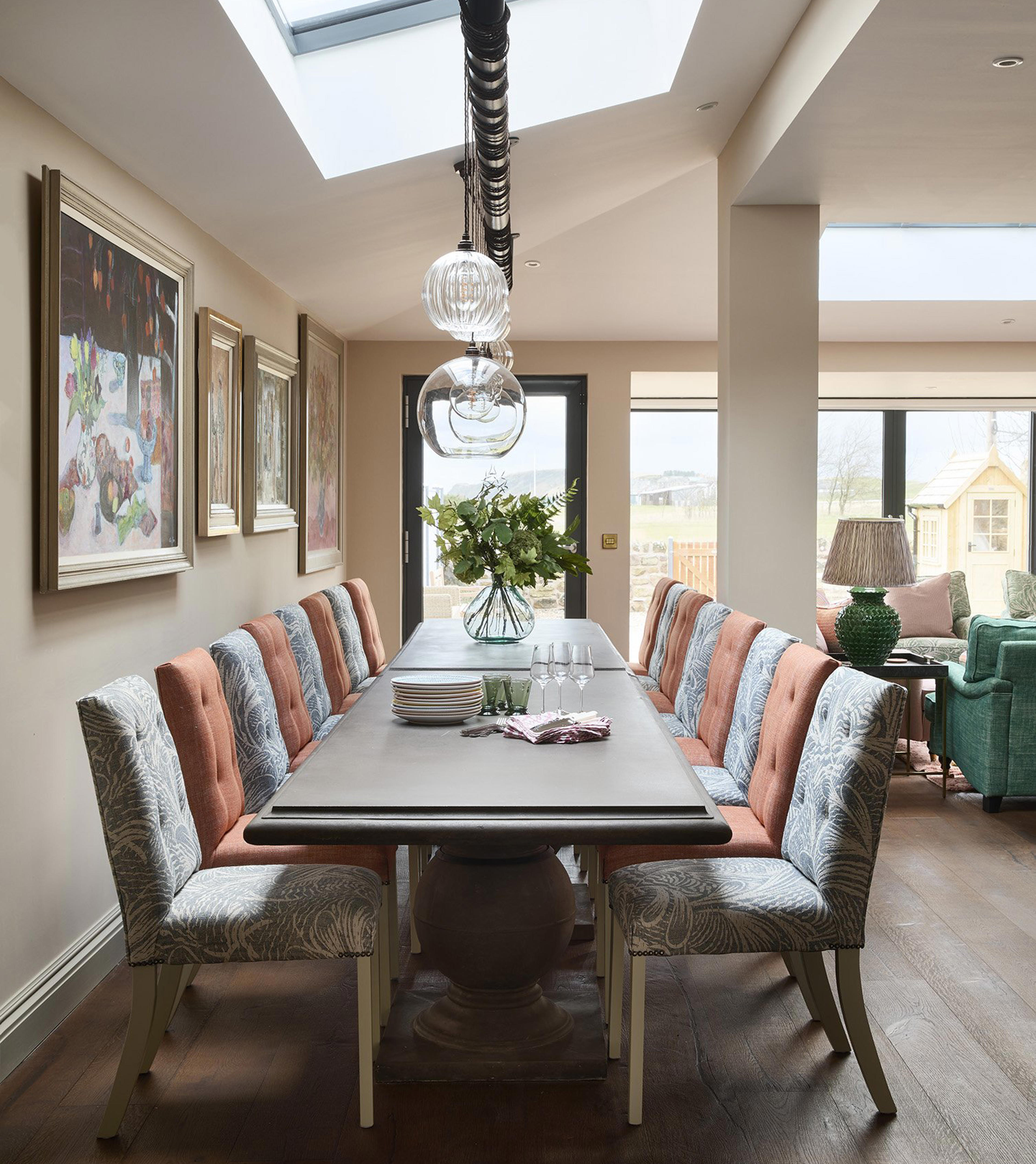 The homeowners loved colour, so they wanted the space to be vibrant and eye-catching. So, Tess decided to paint the walls in a neutral base colour to keep the space light and bright, then introduced lots of colour through the furniture and soft furnishings. The indulgent use of deliberately clashing patterned fabrics creates a sensory overload that stops the whole space from feeling too stark. The addition of brightly coloured art on the walls and a mix of traditional and contemporary furniture makes the new extension feel both warm and welcoming.