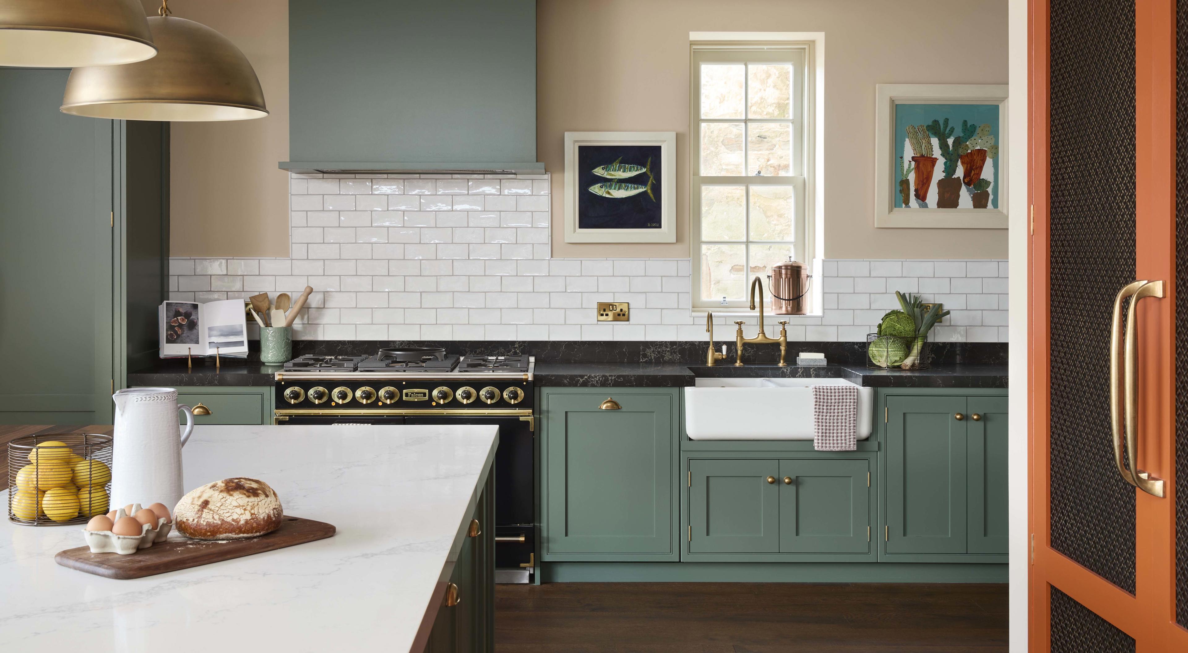 They chose the classic Shaws Double Bowl 800 because of its sleek timeless design and robust practicality, which is only elevated further when fitted with an Aged Brass Ionian Bridge Mixer and Mini Instant Hot Tap from Perrin & Rowe. Traditional Shaker-style cabinetry was commissioned by David L Douglas, and painted in the deep, rich Green Smoke by Farrow and Ball.  The client chose to position the sink under the window, rather than on the island, because they wanted to keep the island clear for hosting and socialising and make the most of a spectacular view. The addition of a large range cooker and the traditional glazed-brick tiles add further to the practical country kitchen aesthetic.