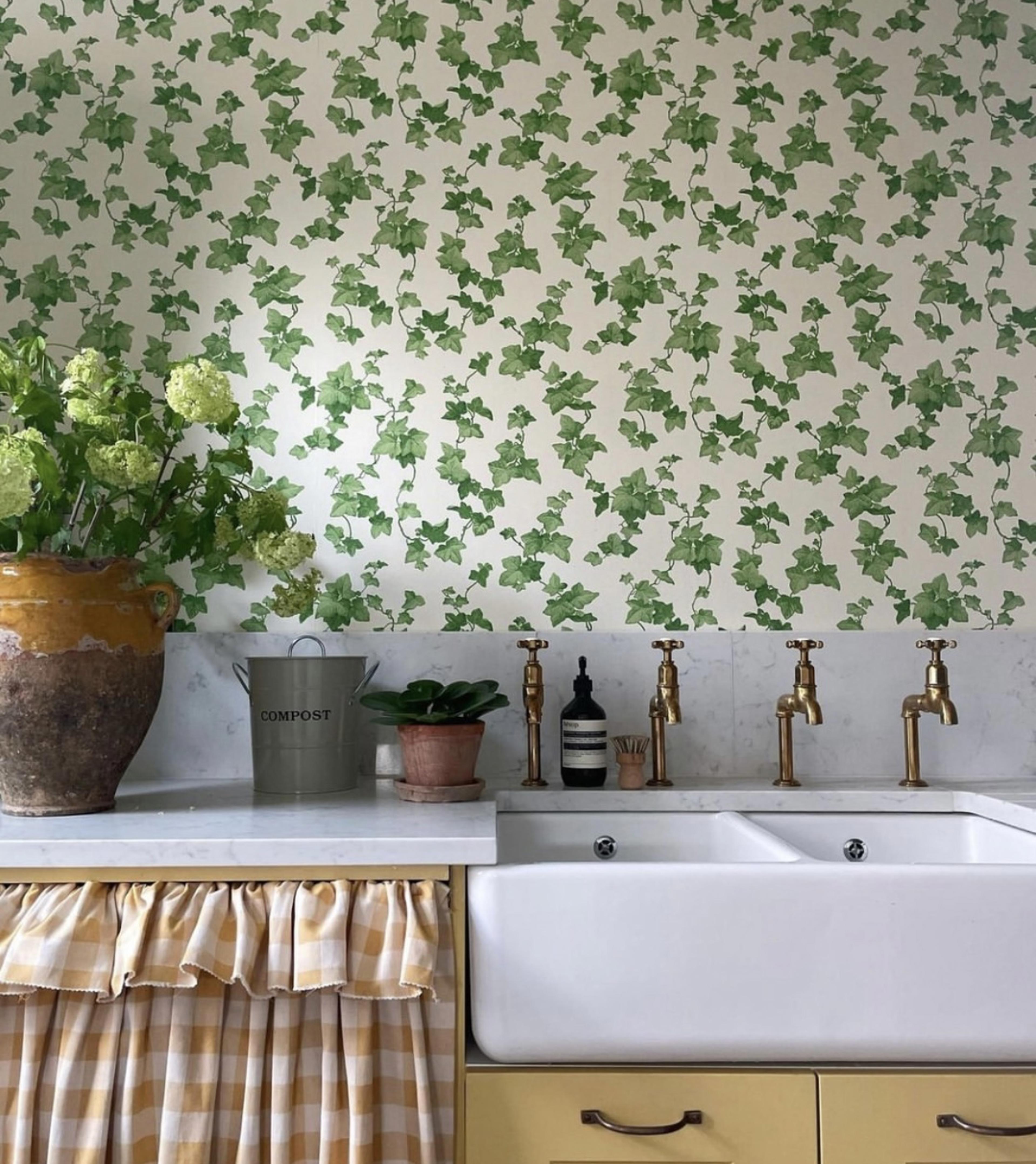 Kitchens and utility rooms are also perfect spaces for bringing a sense of the outside, in. Biophilic design is all about harmonising modern architecture and the outside world; connecting our interior spaces to the natural resources outside. Your choice of wallpaper can be a perfect way to achieve this look. In this utility room a calming Sanderson Hedera Green wallpaper looks perfectly in keeping with four aged brass deVOL Mayan taps, which we make exclusively for the brand.