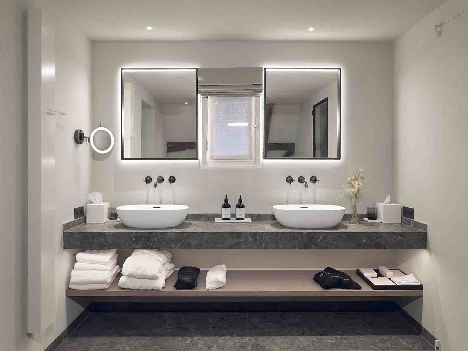The Botanic Sanctuary hotel in Antwerp with its twin Barcelona 55 basins also opted for a floating countertop and shelf for a refined and modern scheme.
