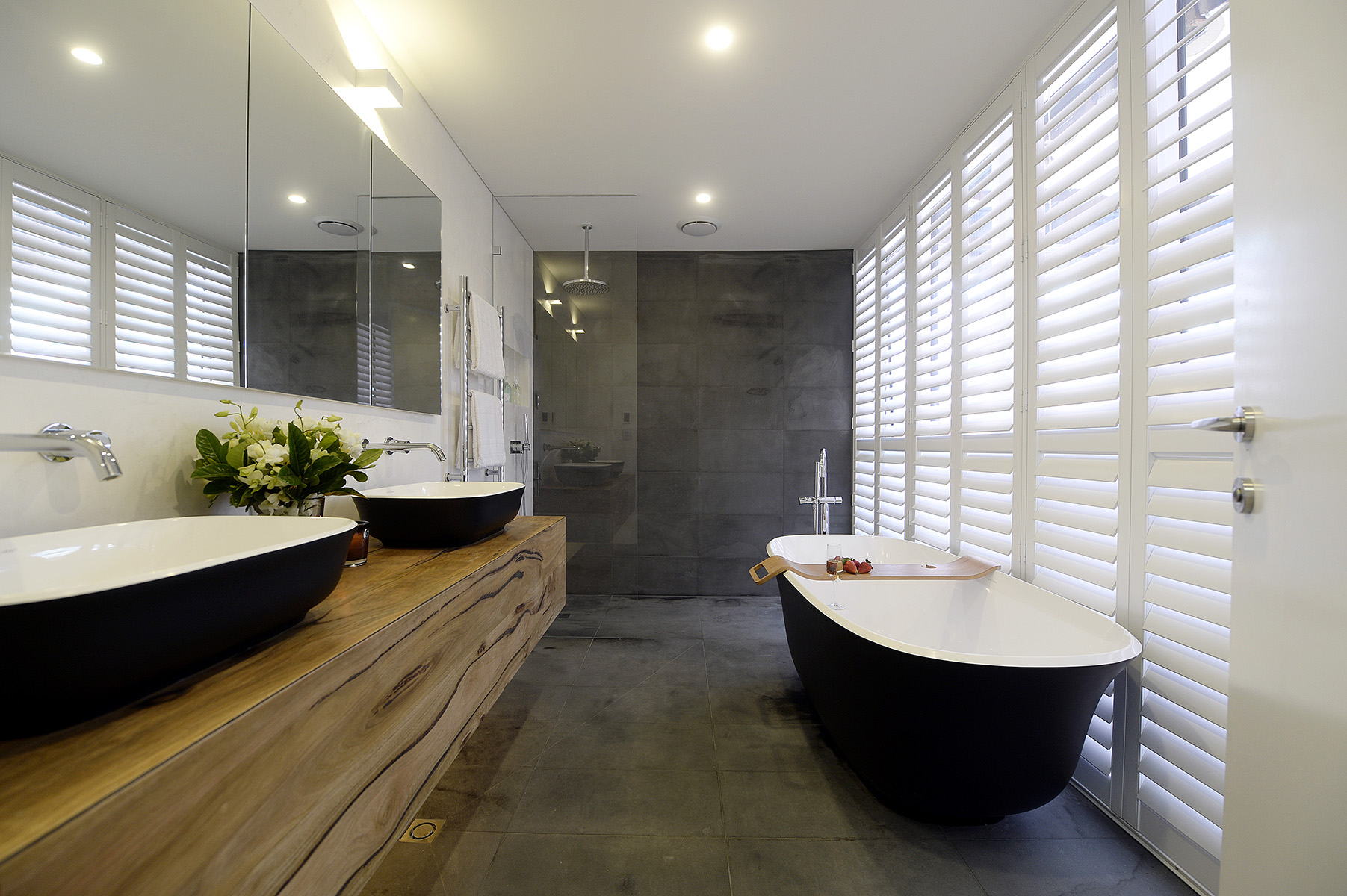 This long and narrow contemporary Australian bathroom features the Victoria + Albert Amiata basins and bath in a Matt Black finish for a contemporary design. The wooden floating worktop adds interest and warmth while plenty of natural light helps to keep the room looking spacious.