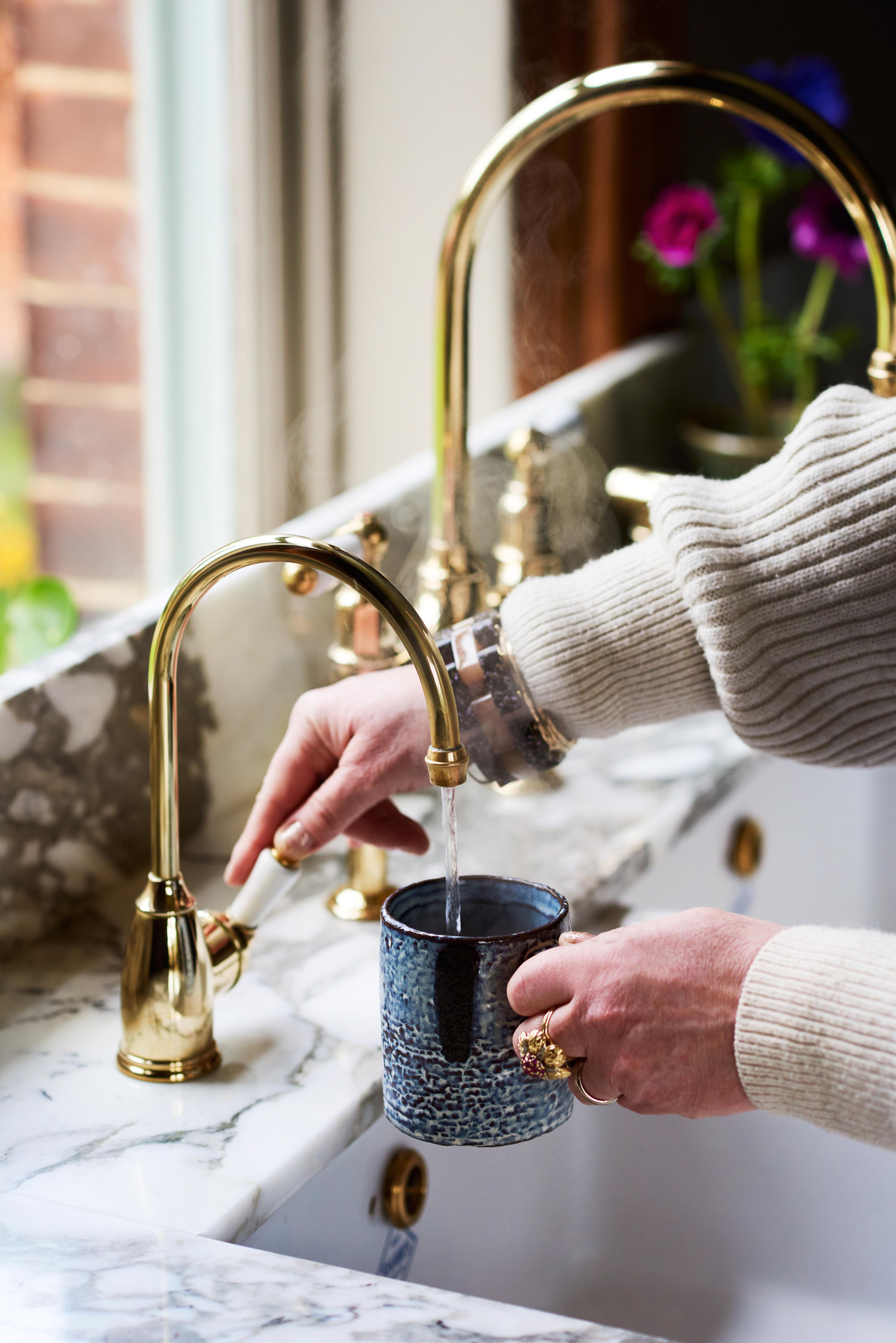 Perrin & Rowe hot water taps come in miniature versions, to sit alongside bridge mixers and other taps in our collection, as well as what we call 3-in-1 designs; one tap that dispenses hot, cold and near boiling water from just two lever handles. We see many customers installing hot water taps alongside smaller sinks as part of kitchen ‘coffee stations’ or bar areas, whilst our 3-in-1 designs mean that even if you are lacking in space or have a smaller kitchen sink you can still install a hot water tap.