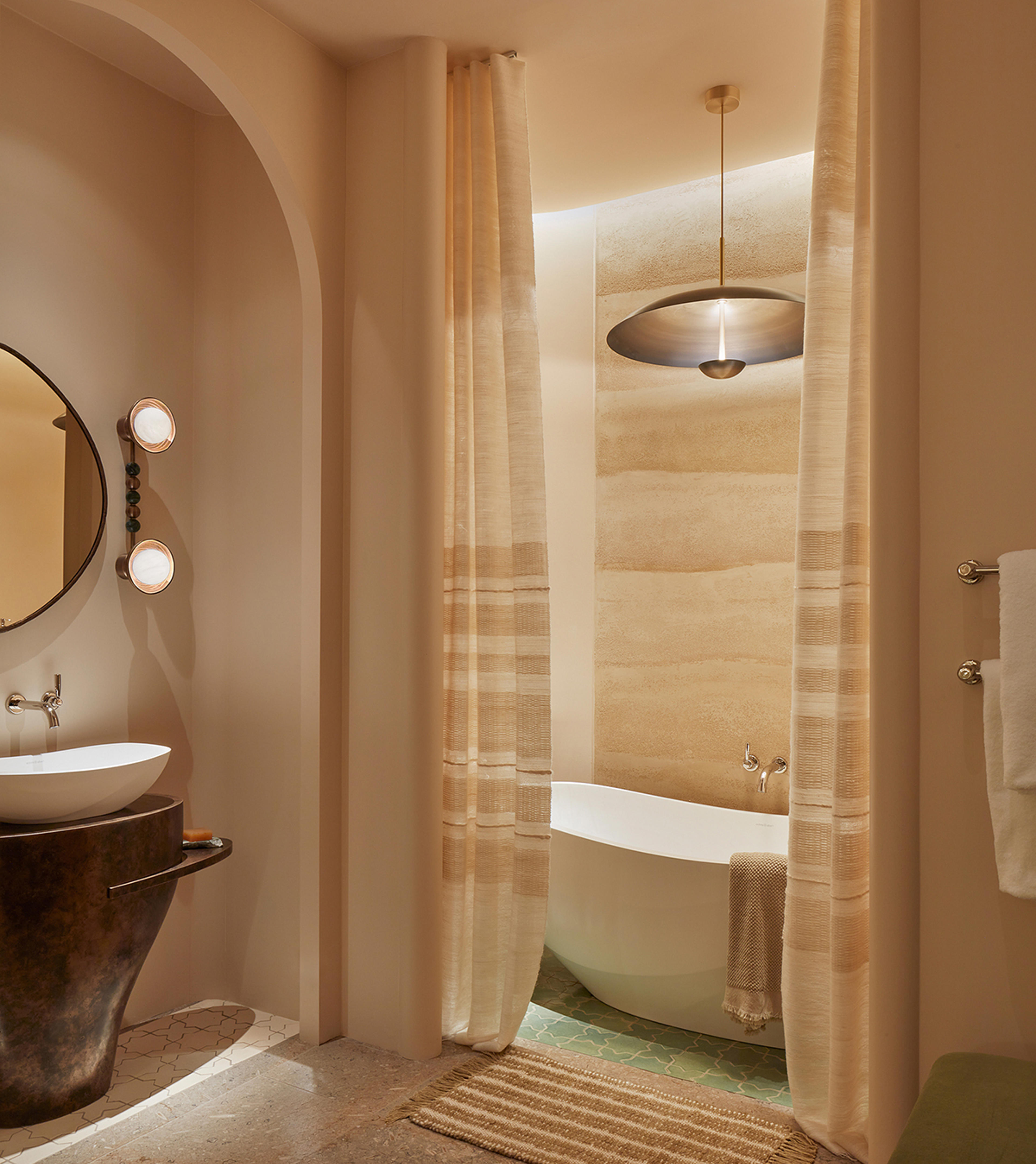 The striking Ore pendant by Atelier 001 was specified for a bold yet harmonious focal point with the bath elegantly framed by handwoven curtains from Coral Stephens Weaving Studio, softening the space and inviting visitors to retreat and relax.