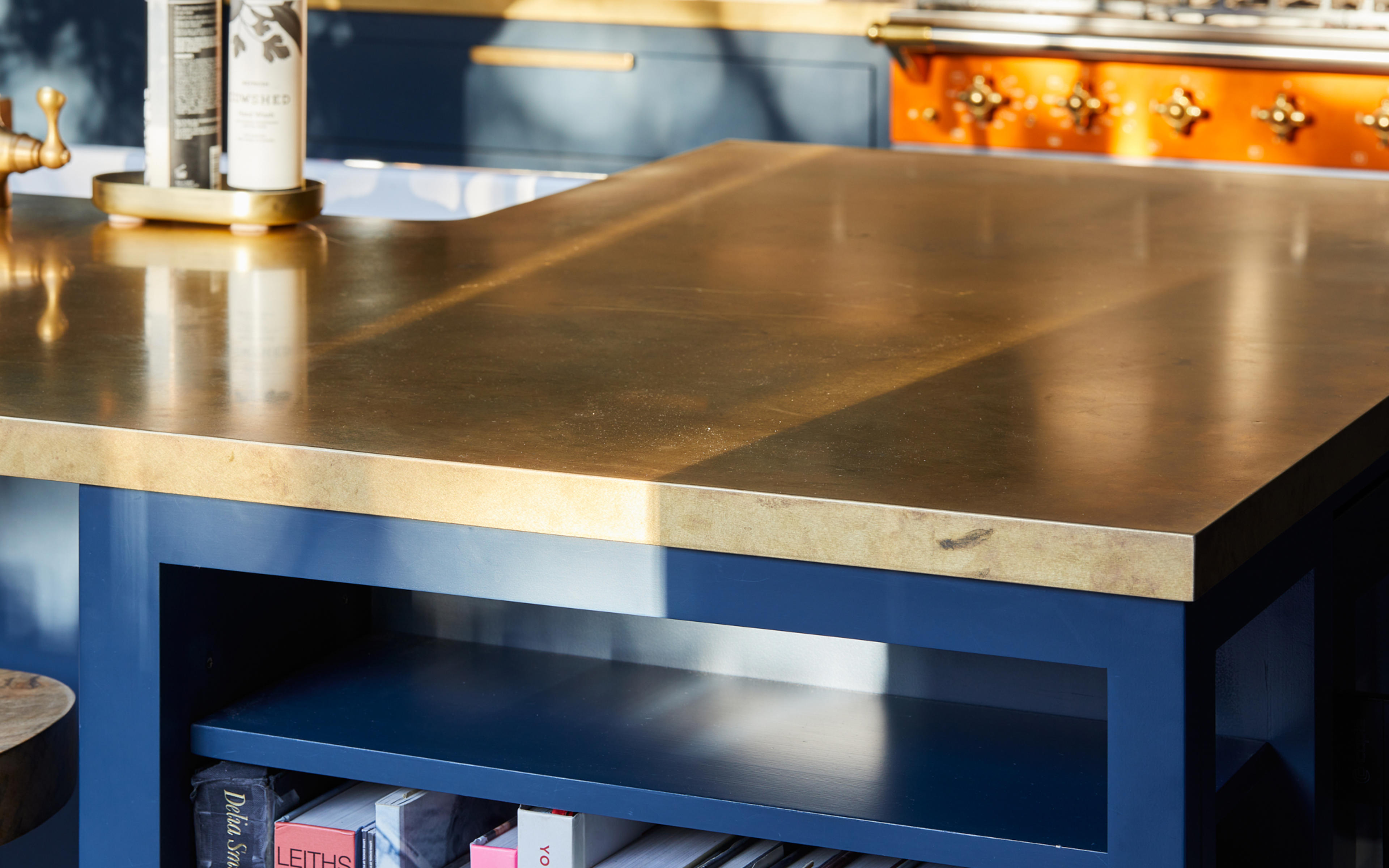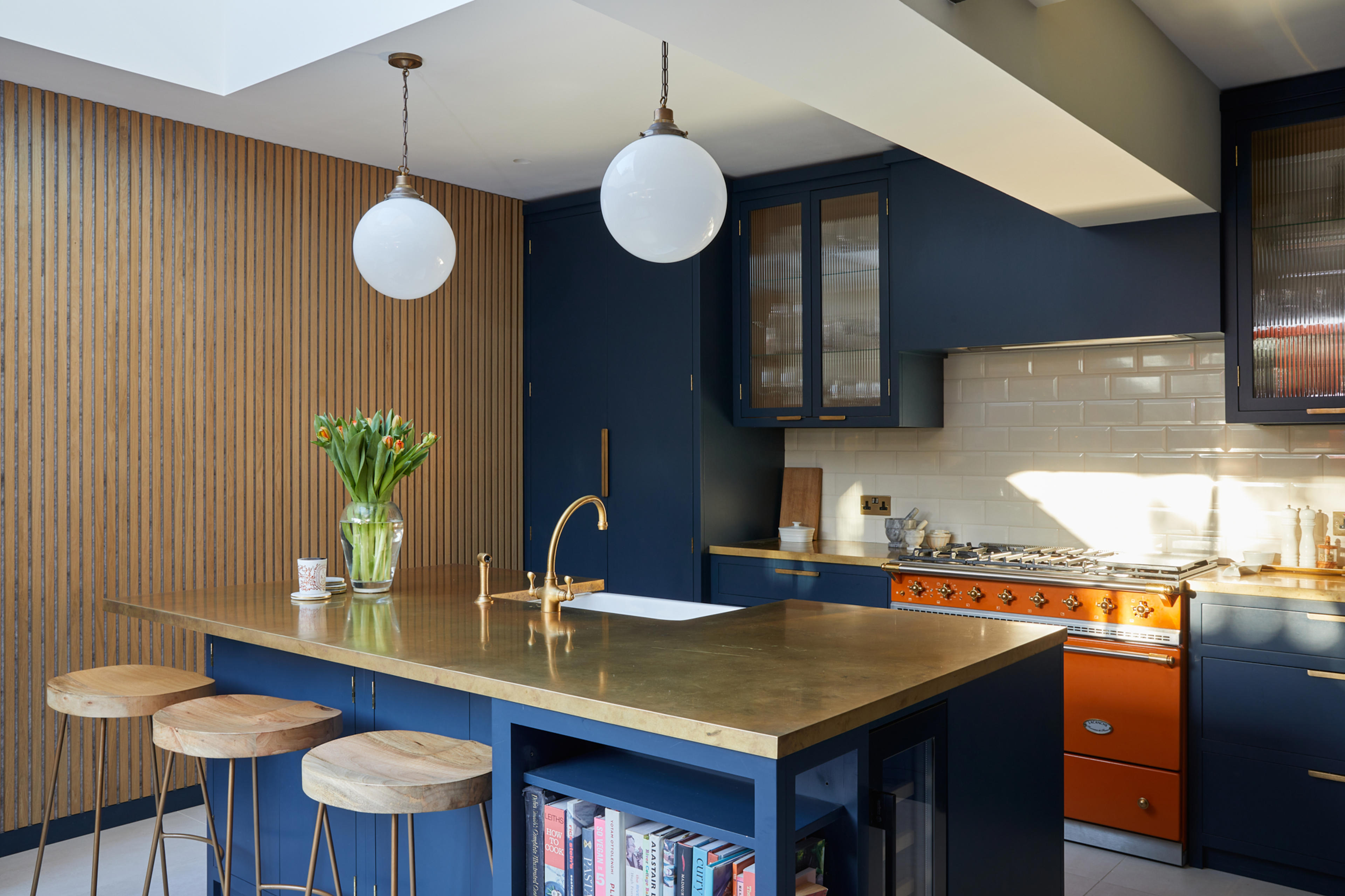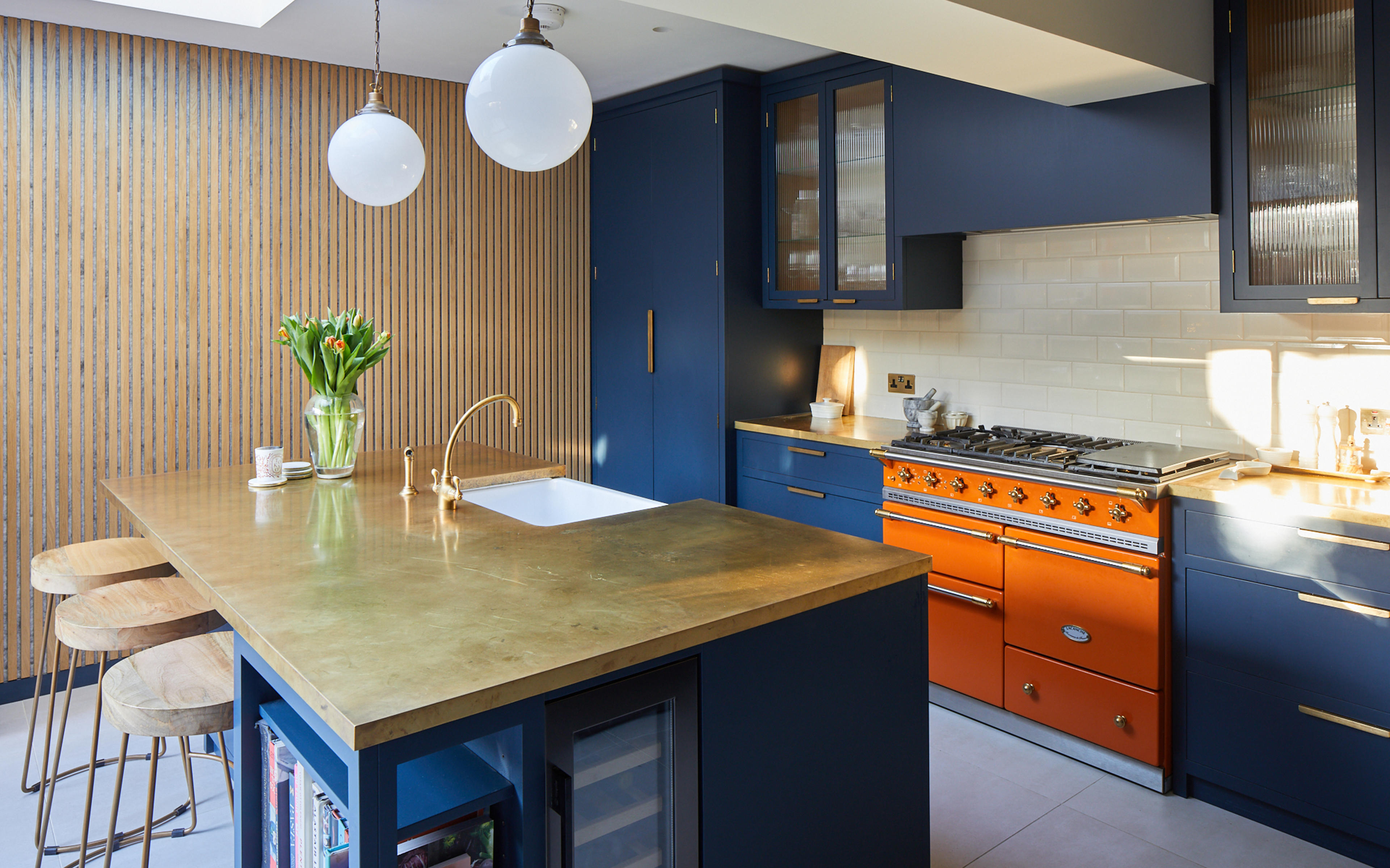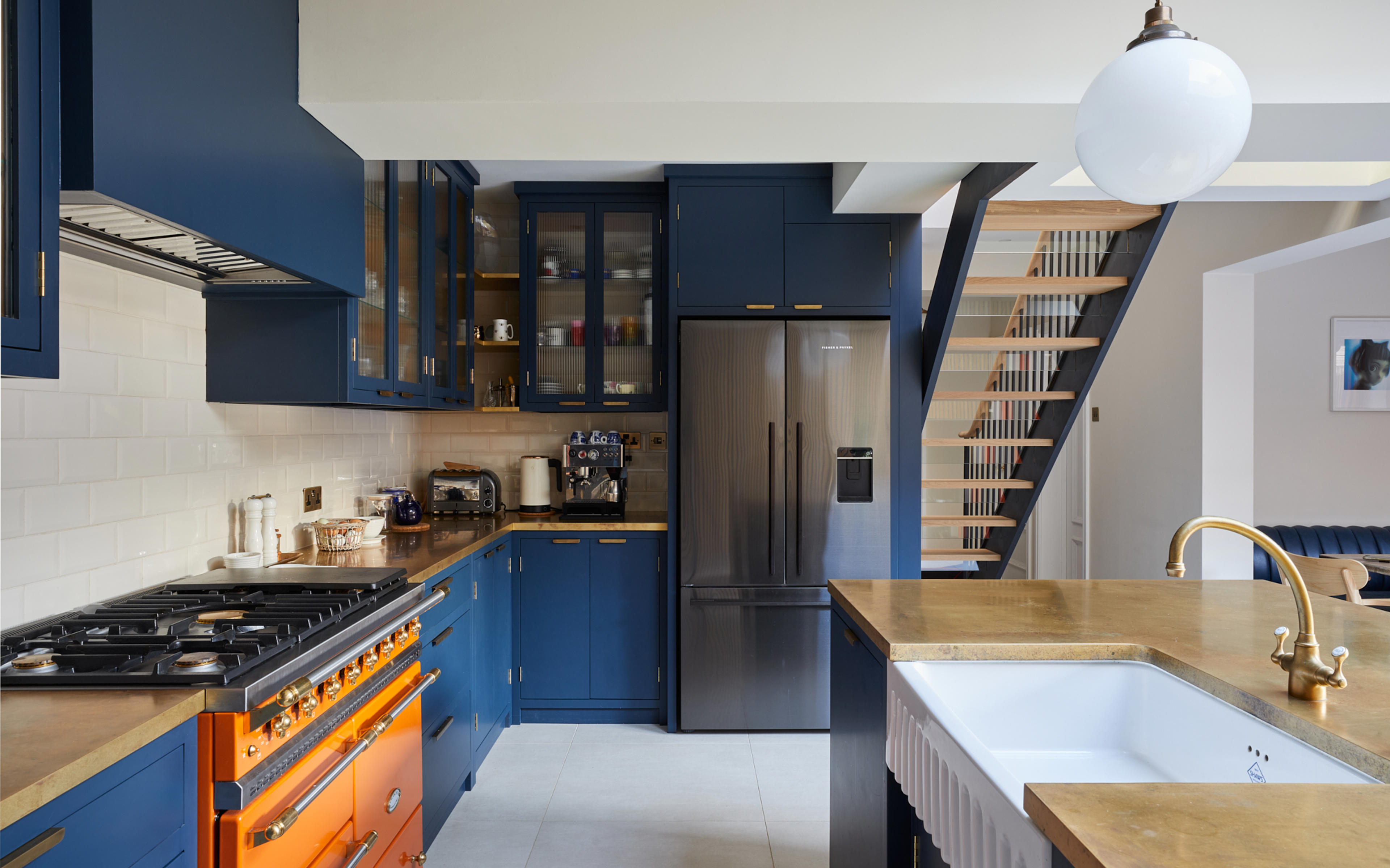 The shade of bold blue is matched perfectly to the external frontage of the Riding House Café, and the use of the wildly contrasting mandarin-coloured Macon Classic dual-fuel range cooker from Lacanche, is inspired by the playful, homely aesthetic made famous by Soho House. The homeowners chose bright orange windows to match the stove, and the natural brass worktops from Modum Worktop add texture and warmth as they softly shimmer – as if finished in gold leaf. The kitchen cabinetry is a smooth-fronted simple design that allows the colours to take centre stage.