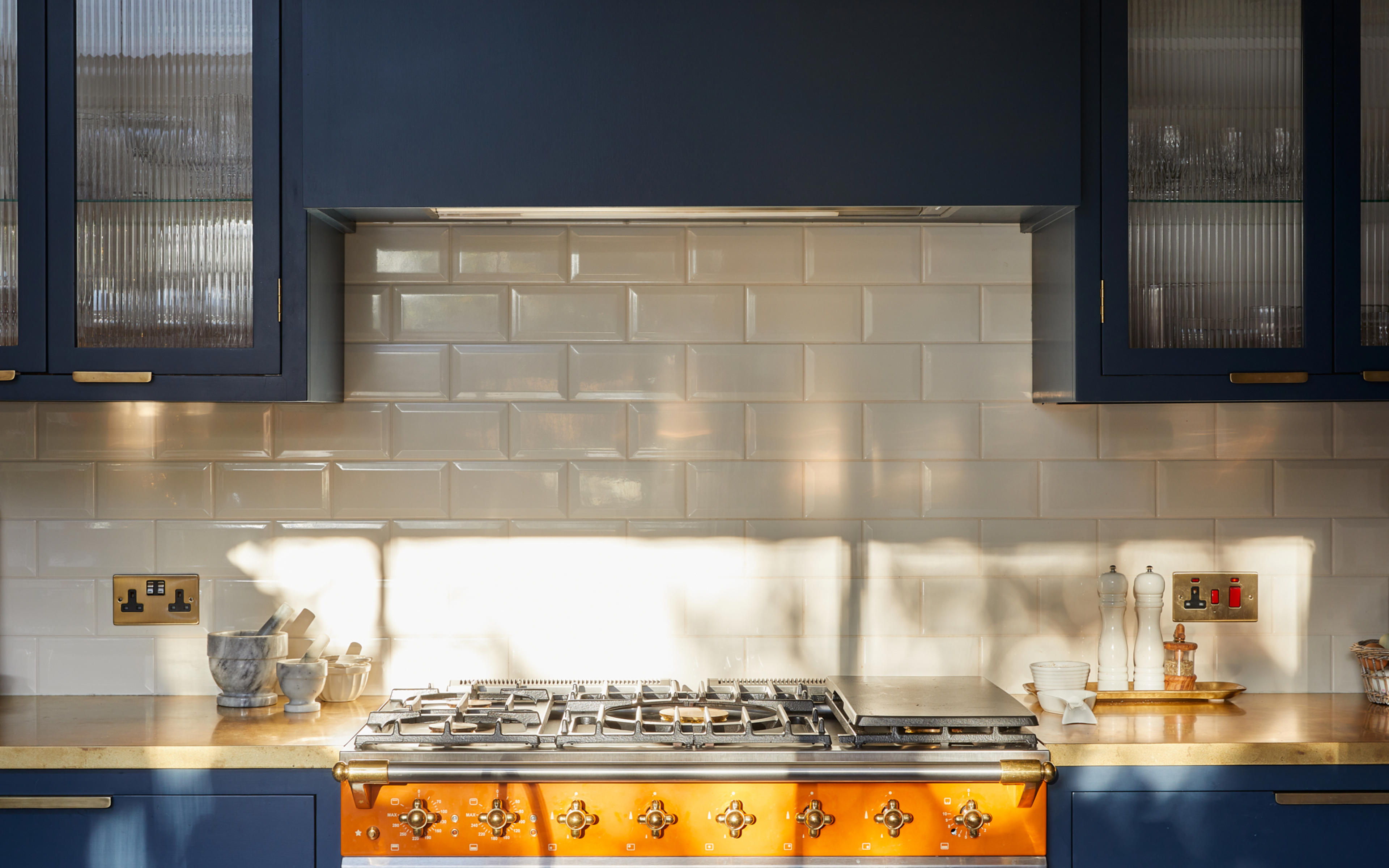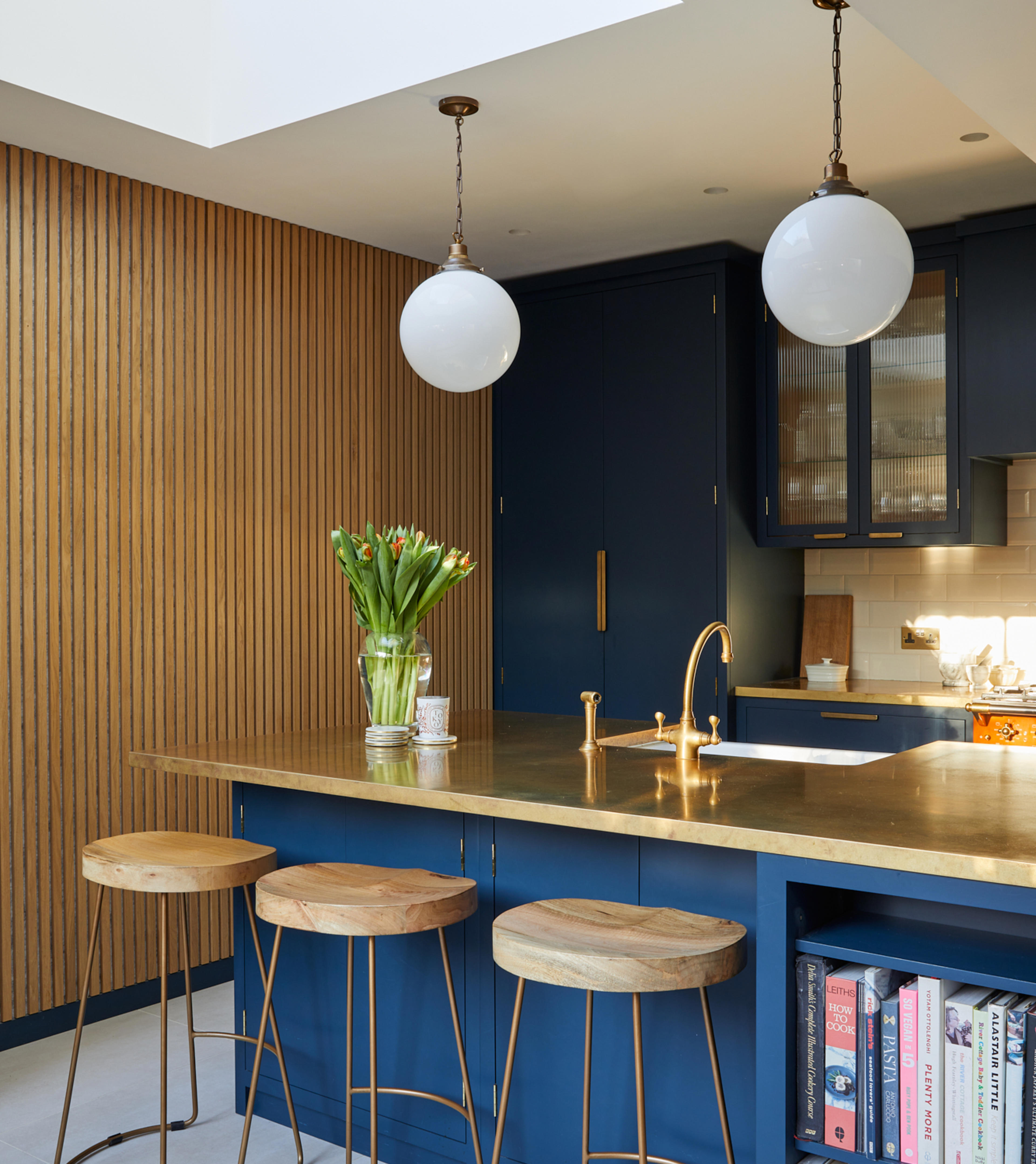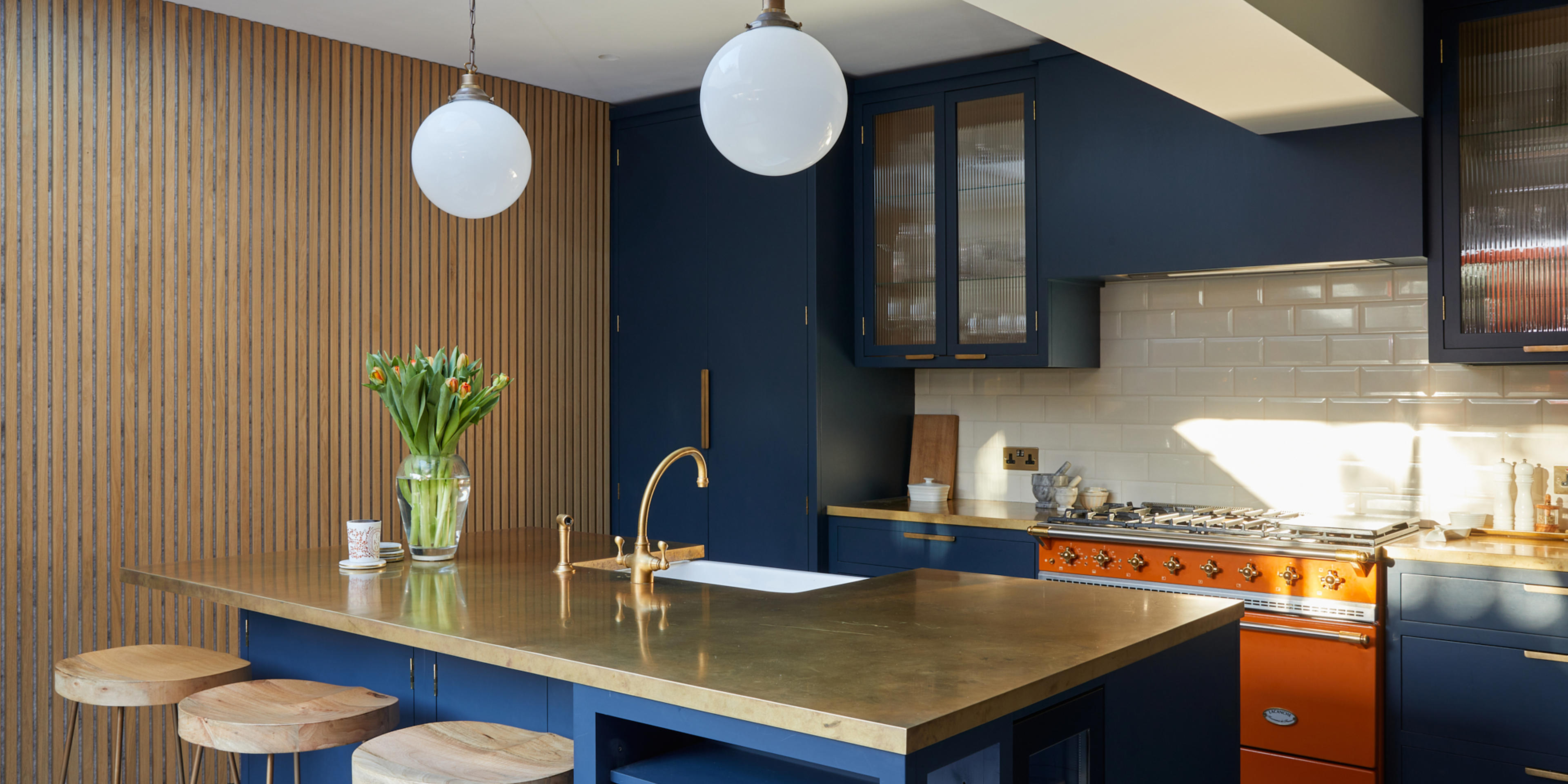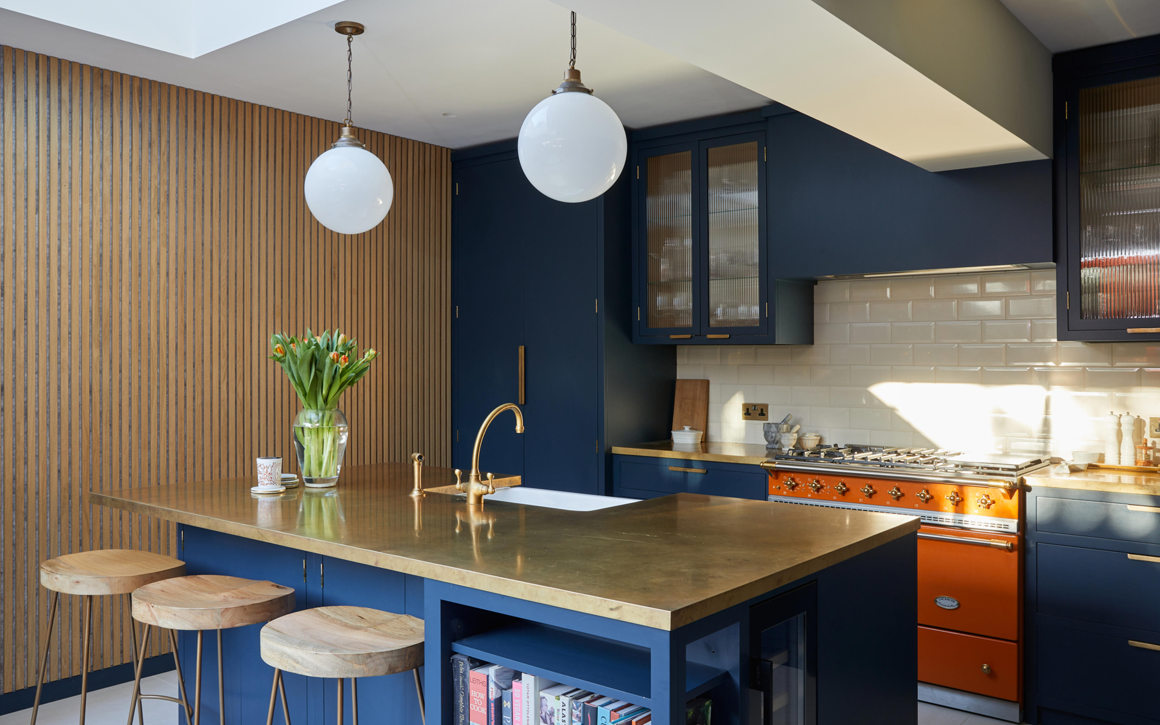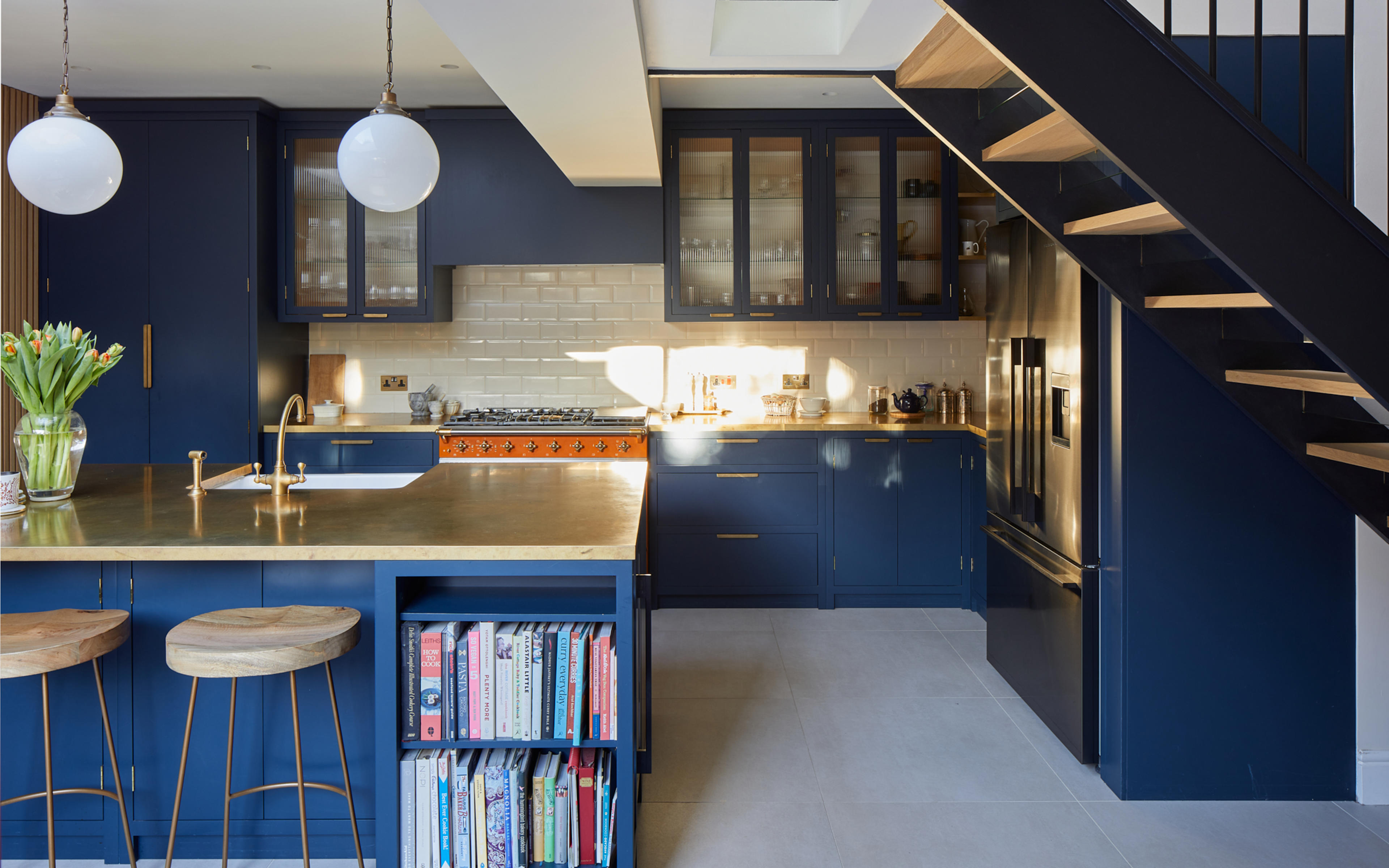 The shade of bold blue is matched perfectly to the external frontage of the Riding House Café, and the use of the wildly contrasting mandarin-coloured Macon Classic dual-fuel range cooker from Lacanche, is inspired by the playful, homely aesthetic made famous by Soho House. The homeowners chose bright orange windows to match the stove, and the natural brass worktops from Modum Worktop add texture and warmth as they softly shimmer – as if finished in gold leaf. The kitchen cabinetry is a smooth-fronted simple design that allows the colours to take centre stage.