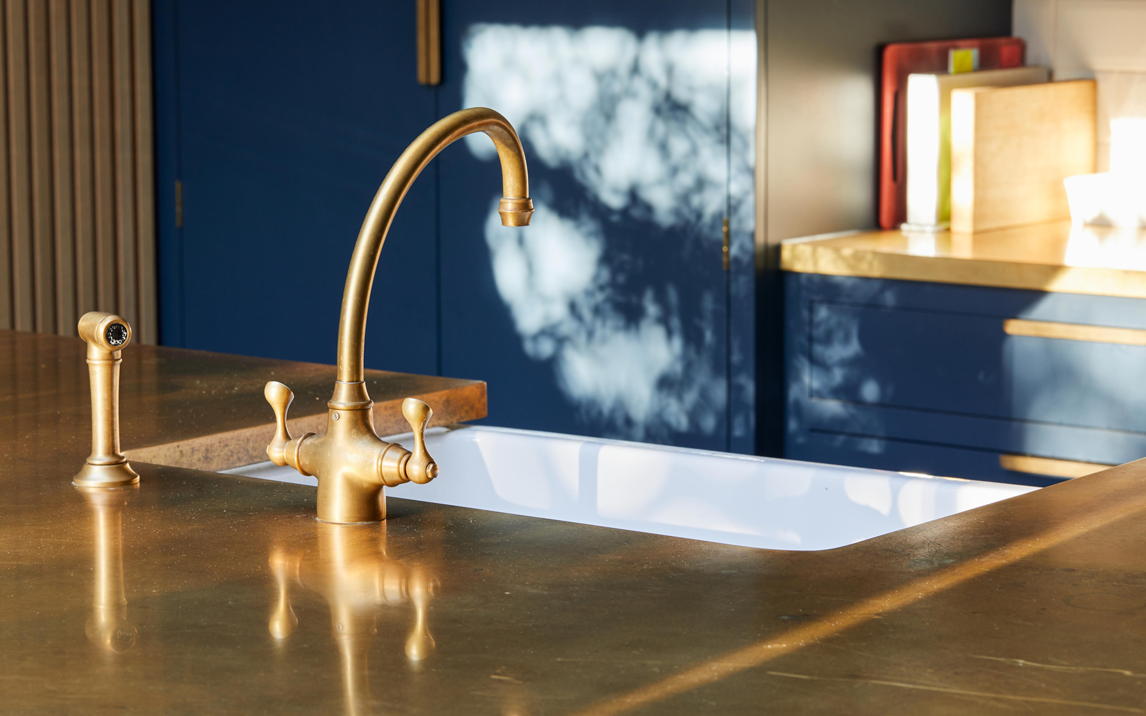 The Bowland 800 sink, chosen for its distinctive detailing and generous size, is positioned on the bespoke brass-topped kitchen island alongside the Etruscan tap and rinse from Perrin & Rowe. Positioned to offer views of the garden and the dining area, the fluted-front sink mirrors the fluted glass kitchen cabinets for a beautifully coordinated look.