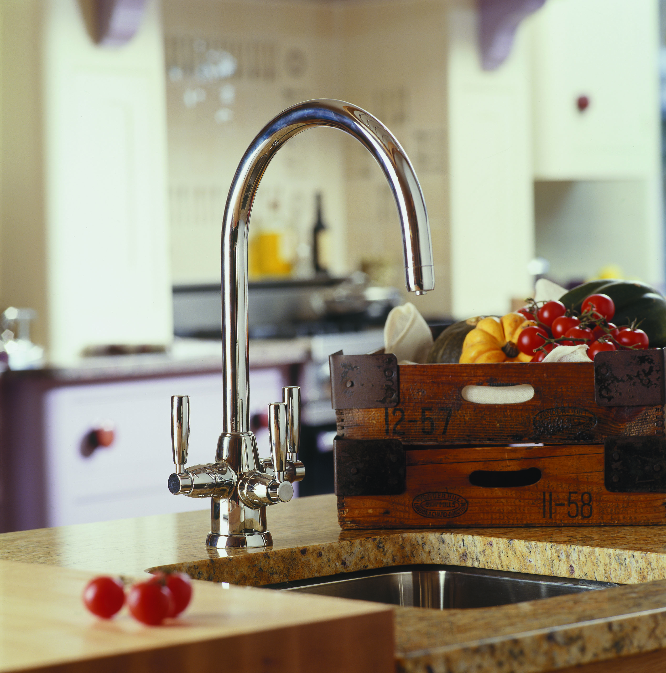 Crafted by hand, but contemporary in style; the Langbourn Sink Mixer with Filtration dispenses filtered drinking water from one lever as well as standard hot and cold water from two additional levers - perfect for the modern kitchen. This design features three levers.