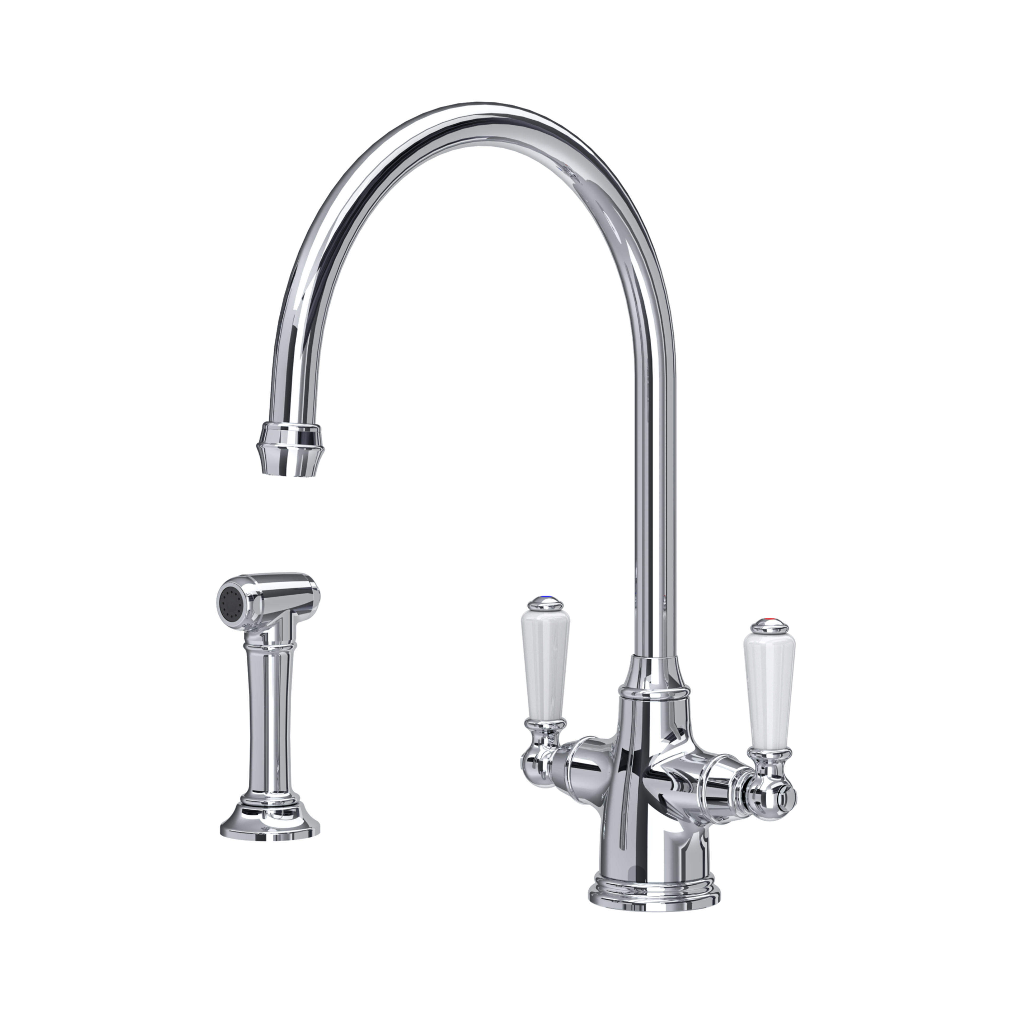 The Phoenician monobloc kitchen mixer is a timeless addition to a traditional or country style kitchen, and one of our best-selling models. Featuring beautiful porcelain inserts on two lever handles, it's an instantly recognisable Perrin & Rowe tap. This version also features a useful side spray rinse for cleaning the sink or rinsing pots and pans.