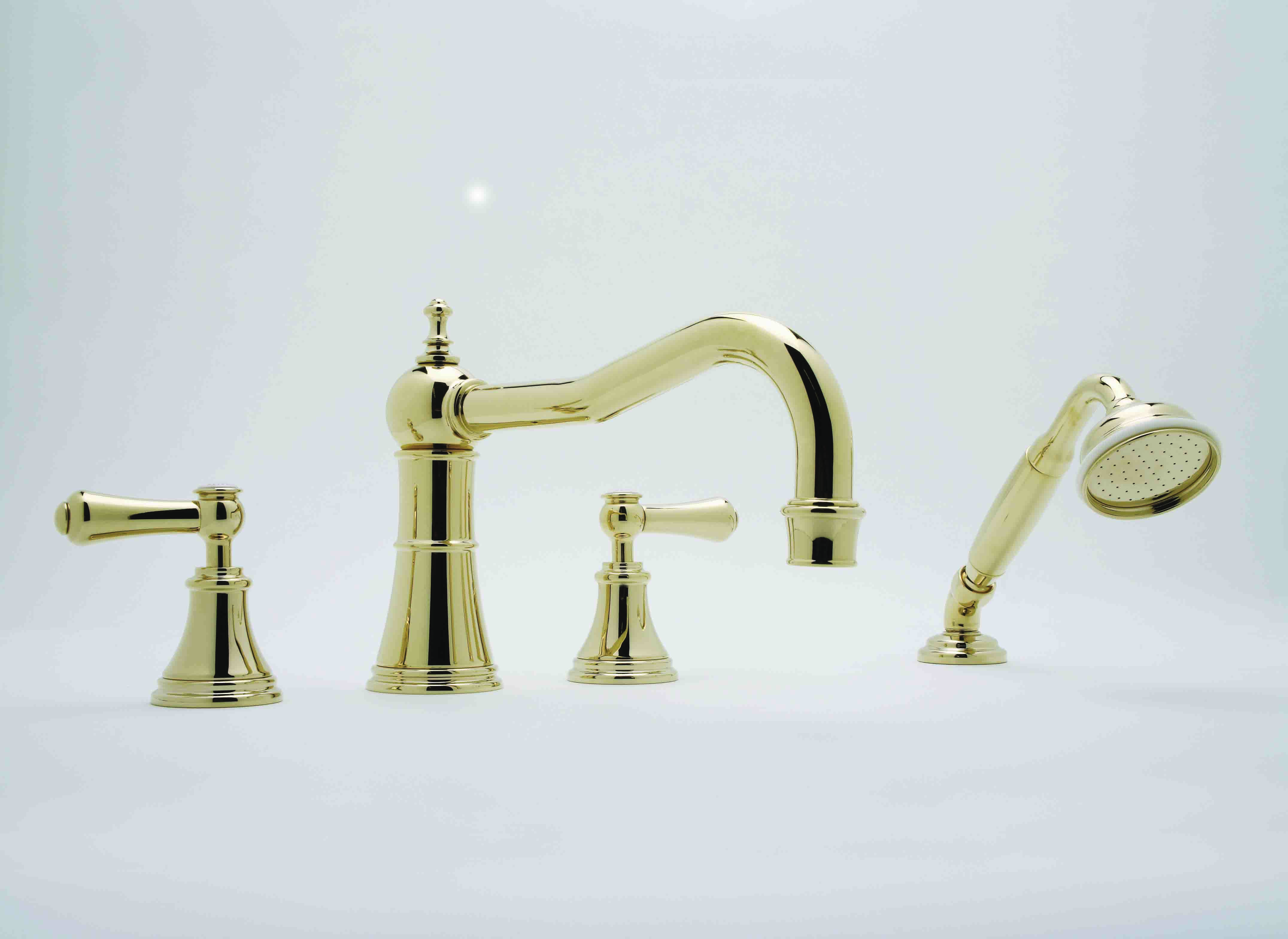The Perrin & Rowe Georgian collection is features ornate yet delicate detailing, perfect for traditional yet elegant bathrooms. This Georgian four-hole bath set features a curvaceous spout, practical handshower and beautiful ceramic 'Hot' and 'Cold' indices on the lever handles.