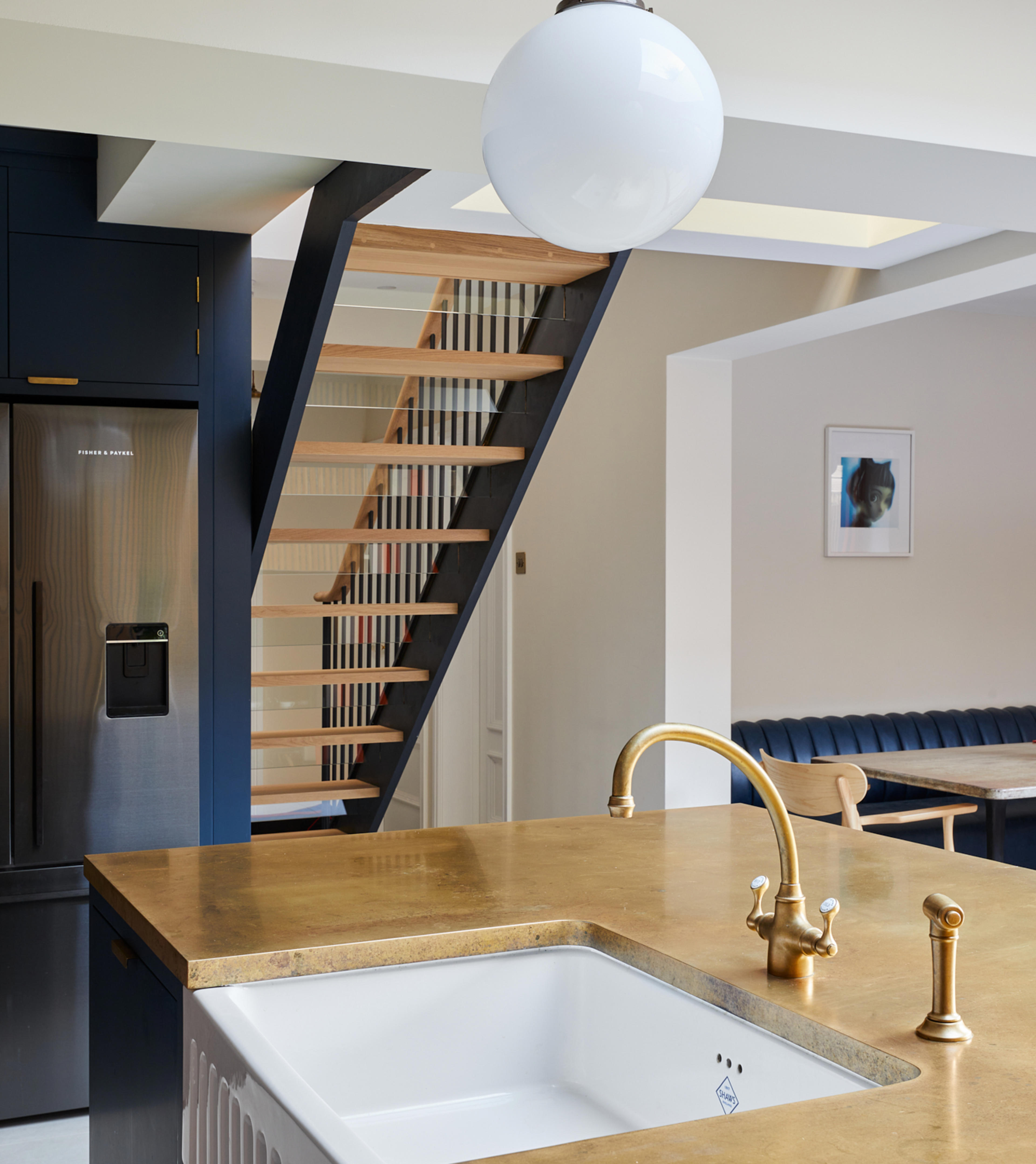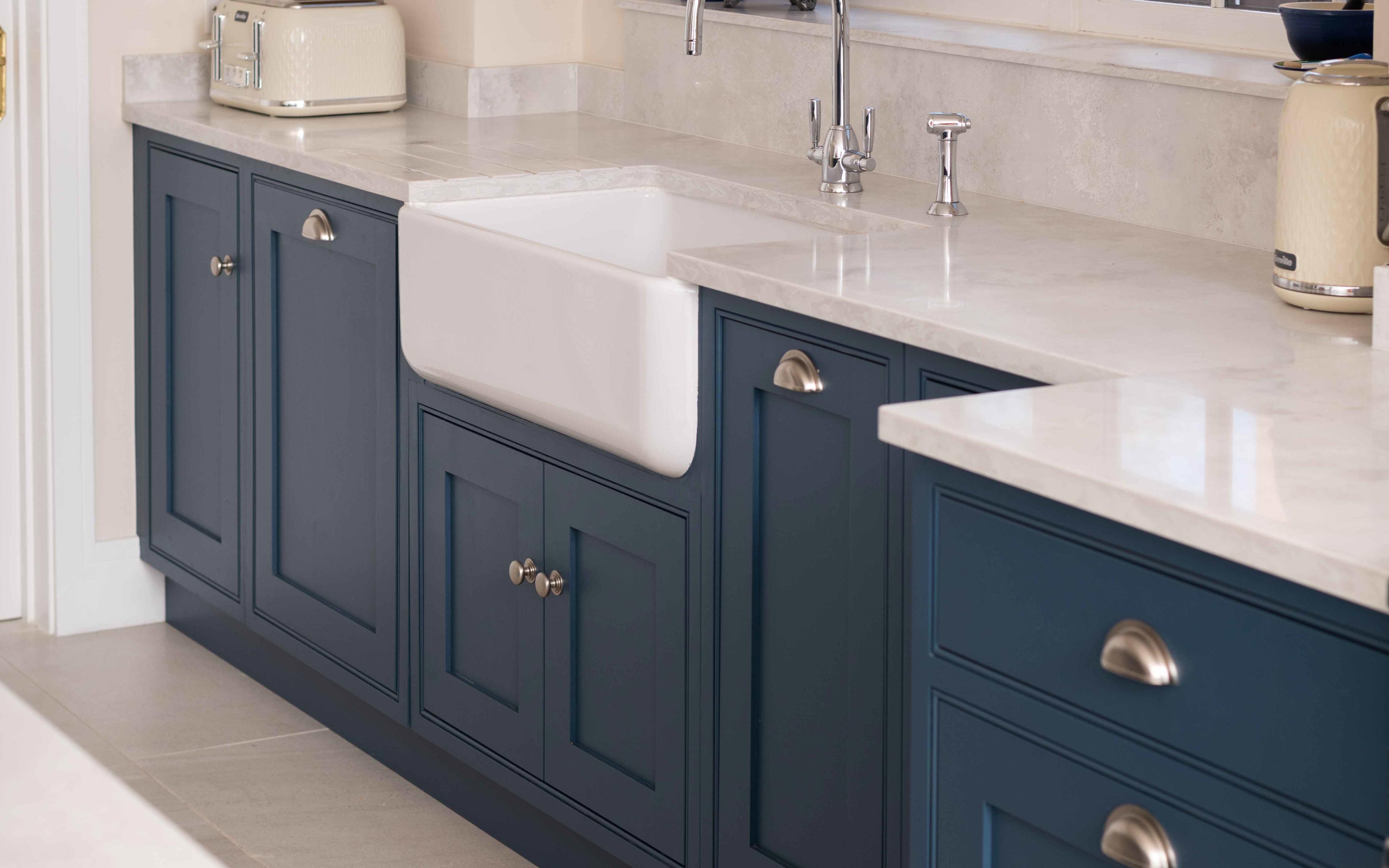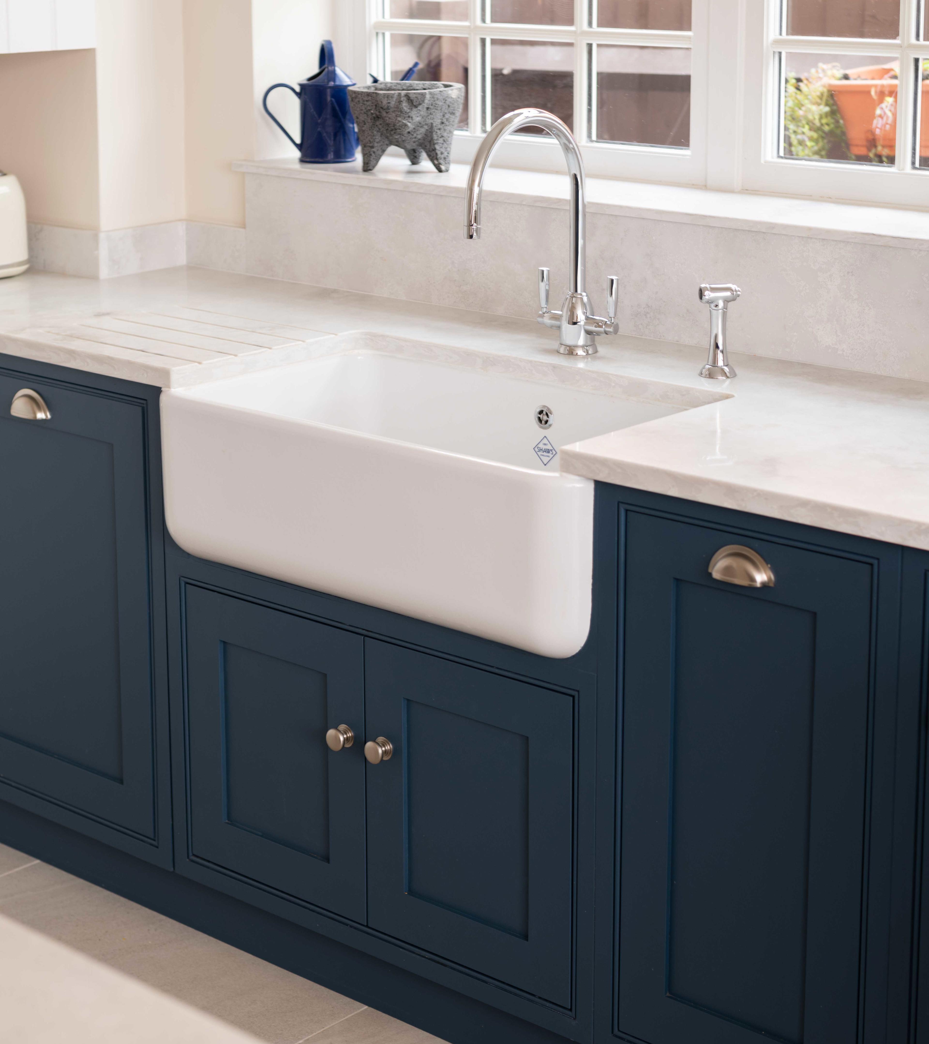 The couple enjoy nothing more than having their family over for a Sunday roast so a large sink was key for entertaining. The sink – with its iconic blue diamond – looks perfect paired with the classic Shaker style cabinetry, and creates a timeless feel to the new kitchen.  A classic and contemporary chrome tap and rinse from Perrin & Rowe's Langbourn collection  sits perfectly alongside the glazed fireclay sink, which is positioned under a window for more light.