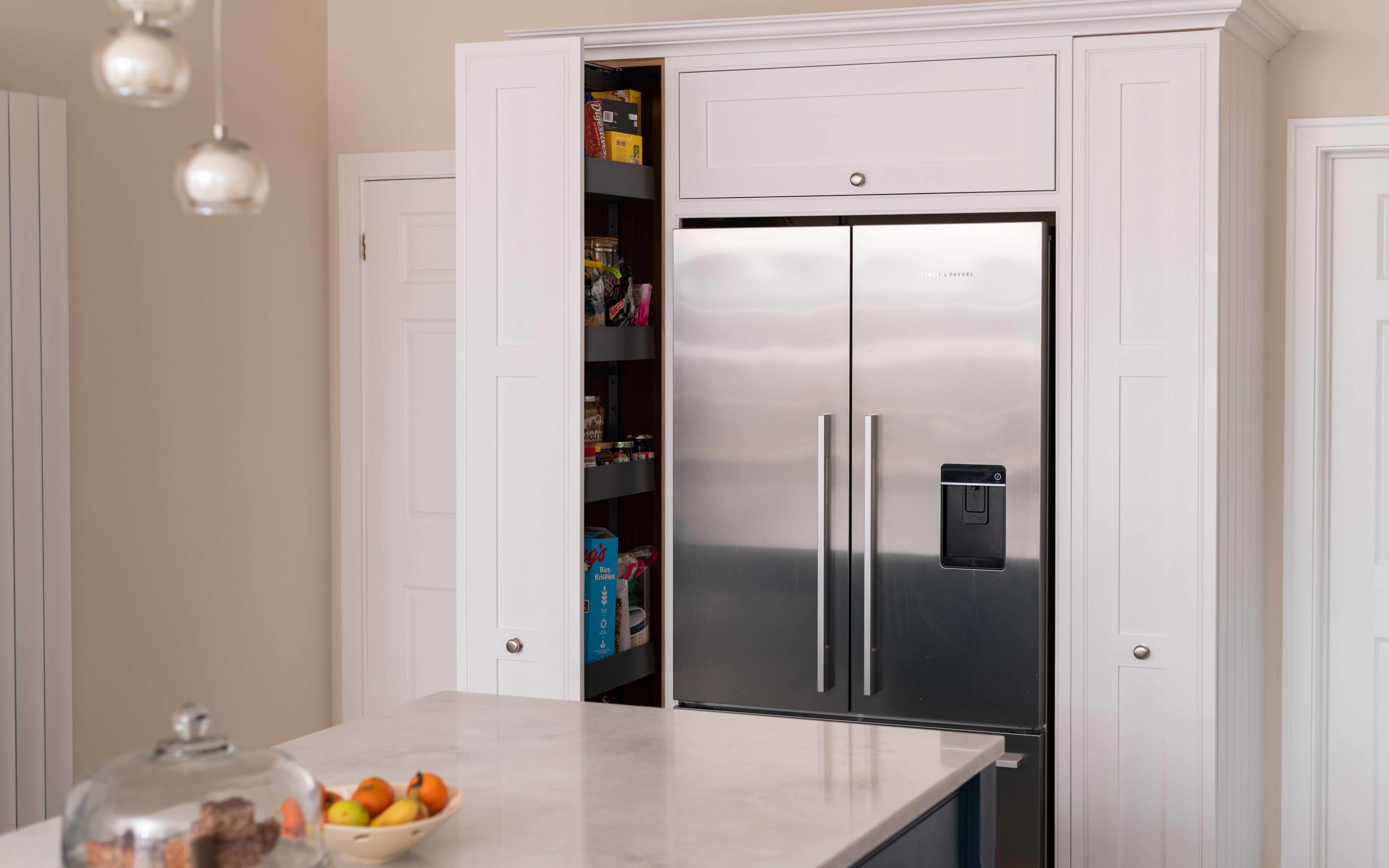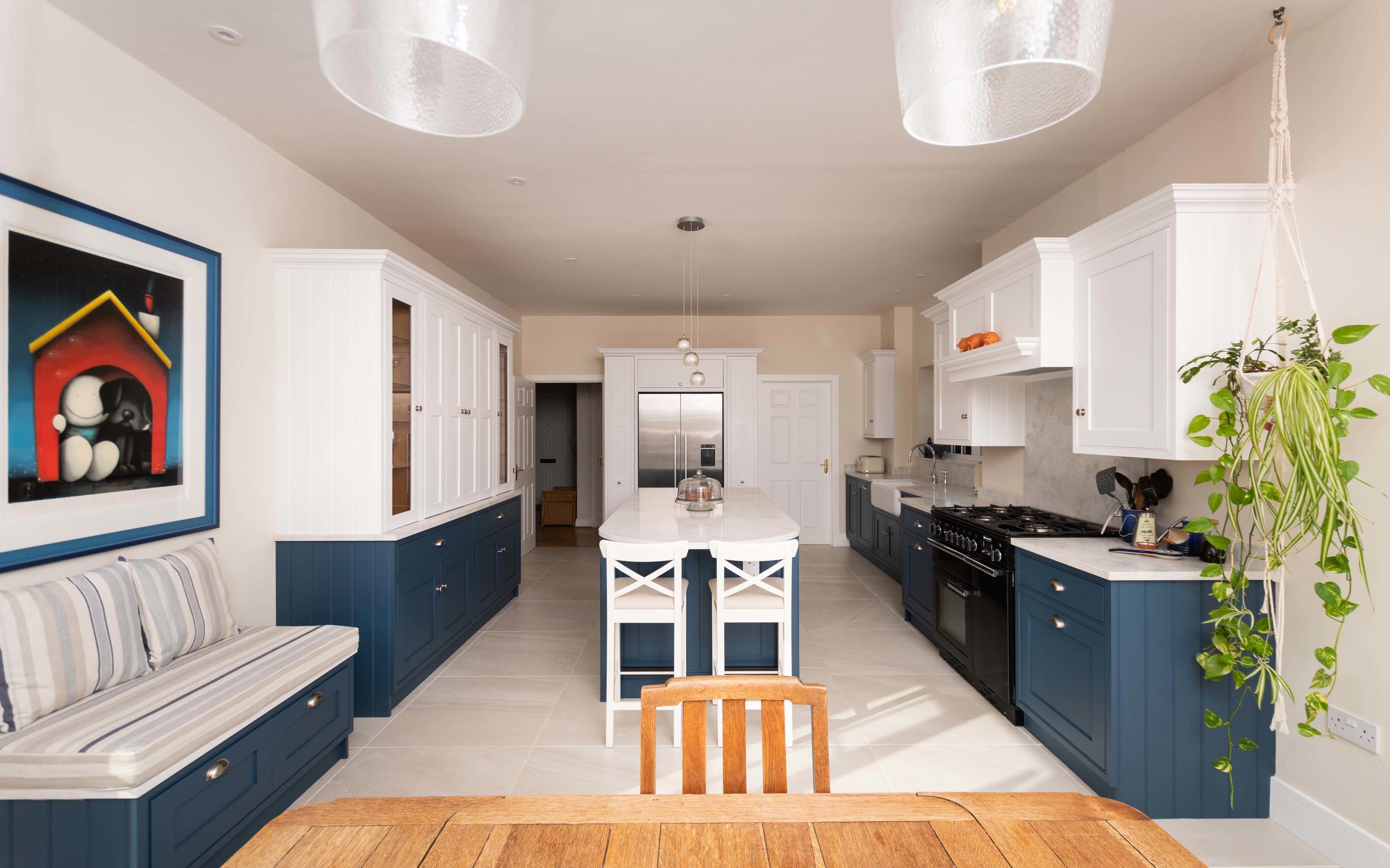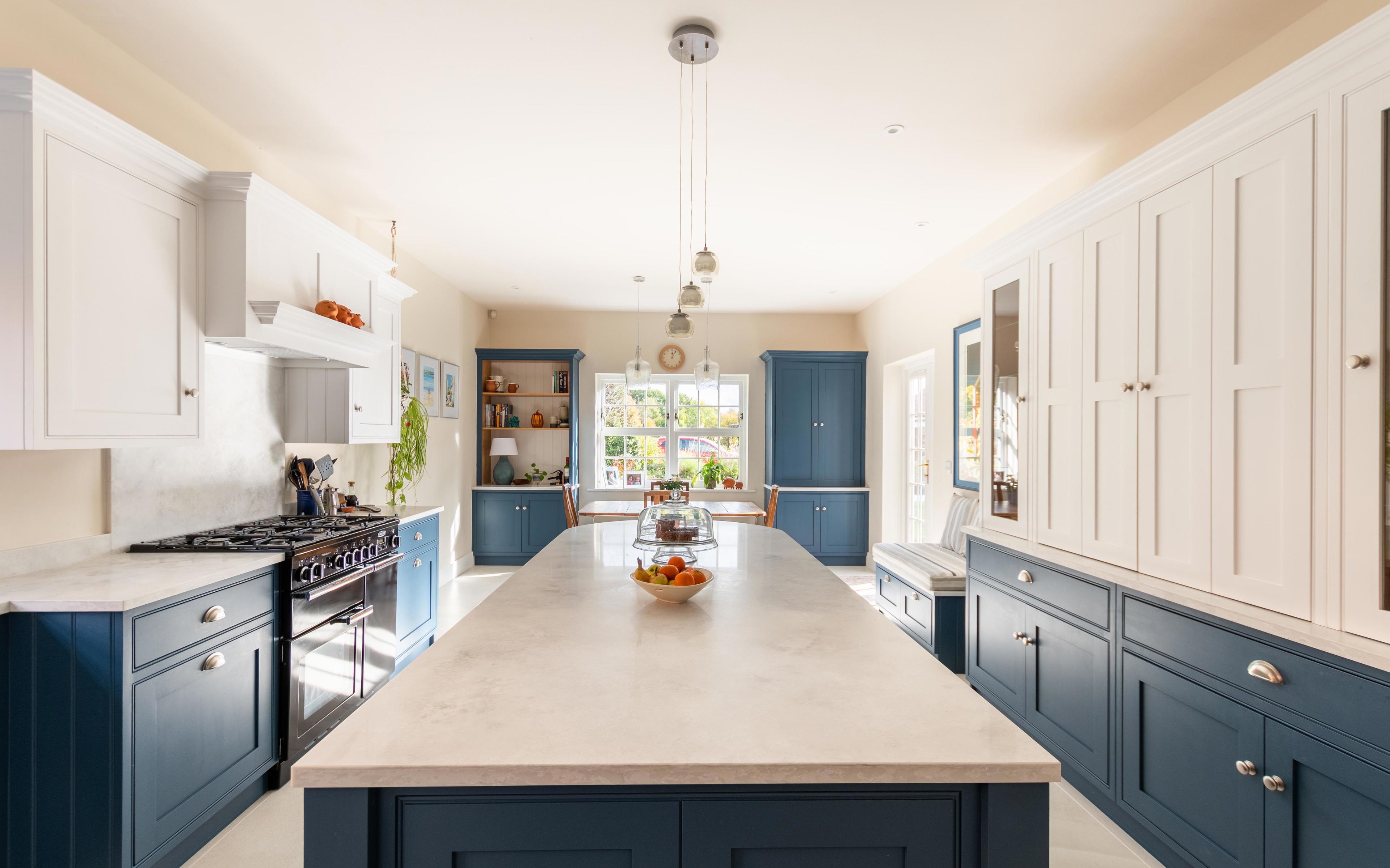 This included handmade bespoke dressers at the end of the room, a bi-fold breakfast larder with quartz worktop inside for extra work surface and storage needs, full height pull out larders, and a bench seat.