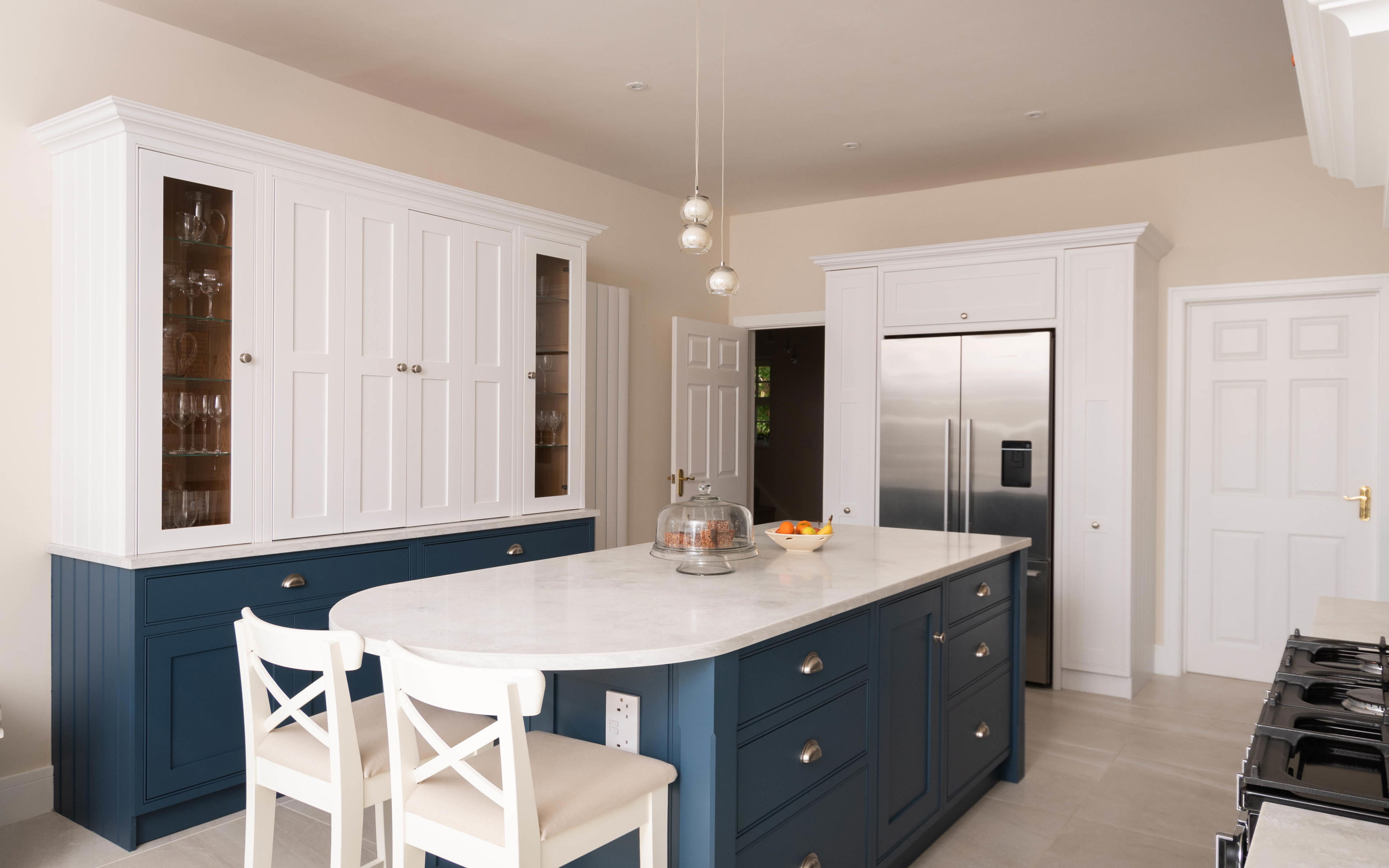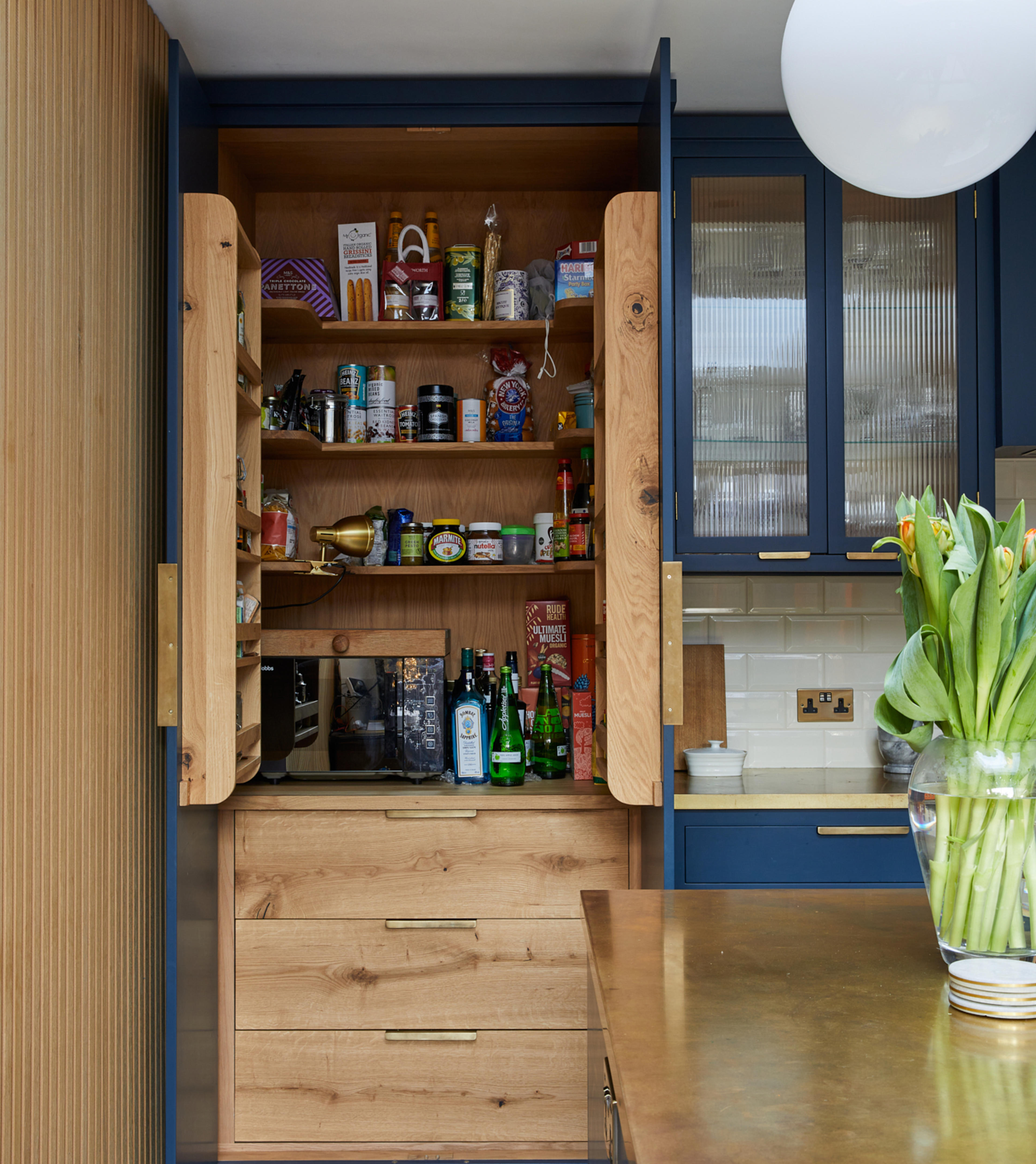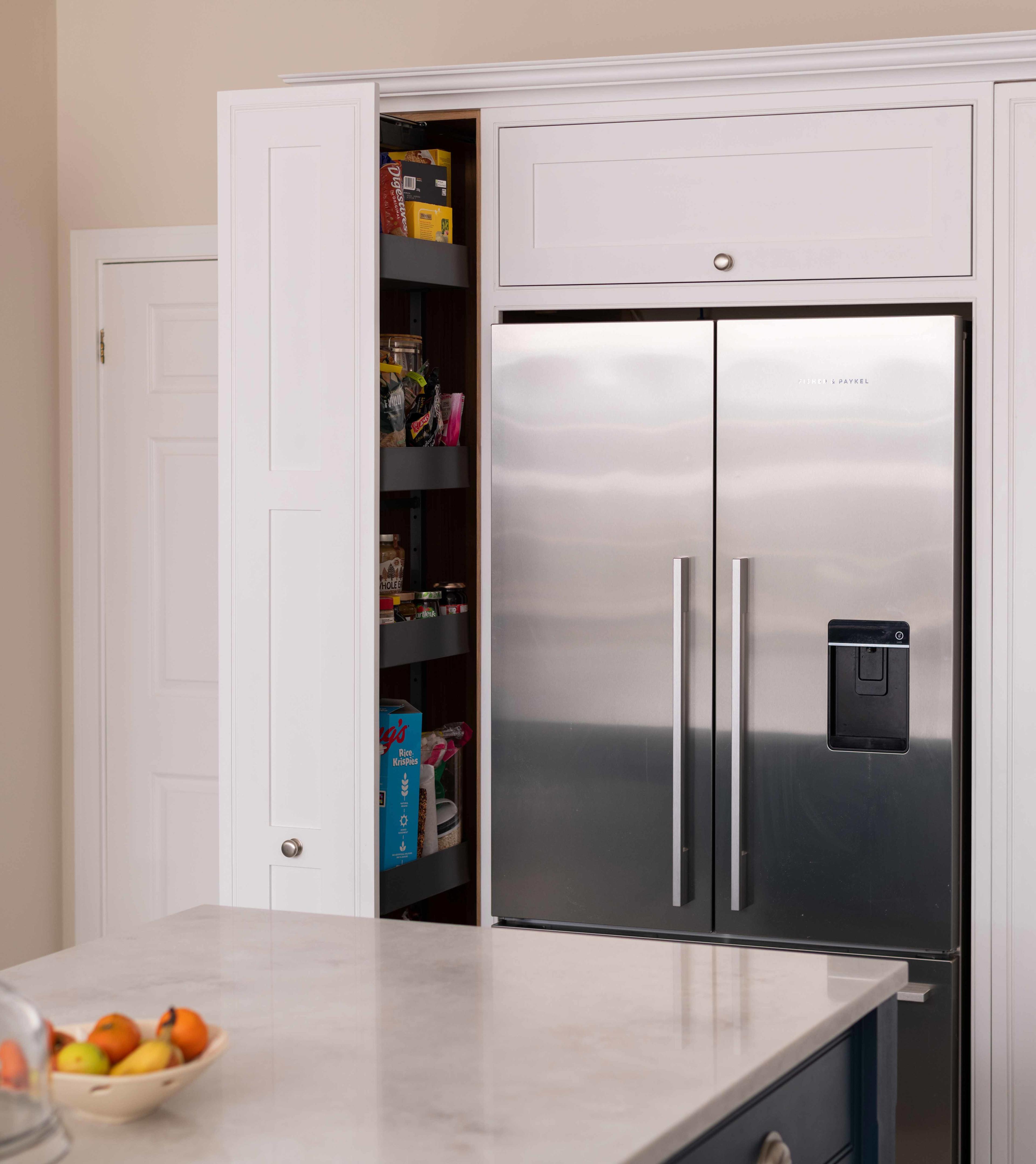 This included handmade bespoke dressers at the end of the room, a bi-fold breakfast larder with quartz worktop inside for extra work surface and storage needs, full height pull out larders, and a bench seat.