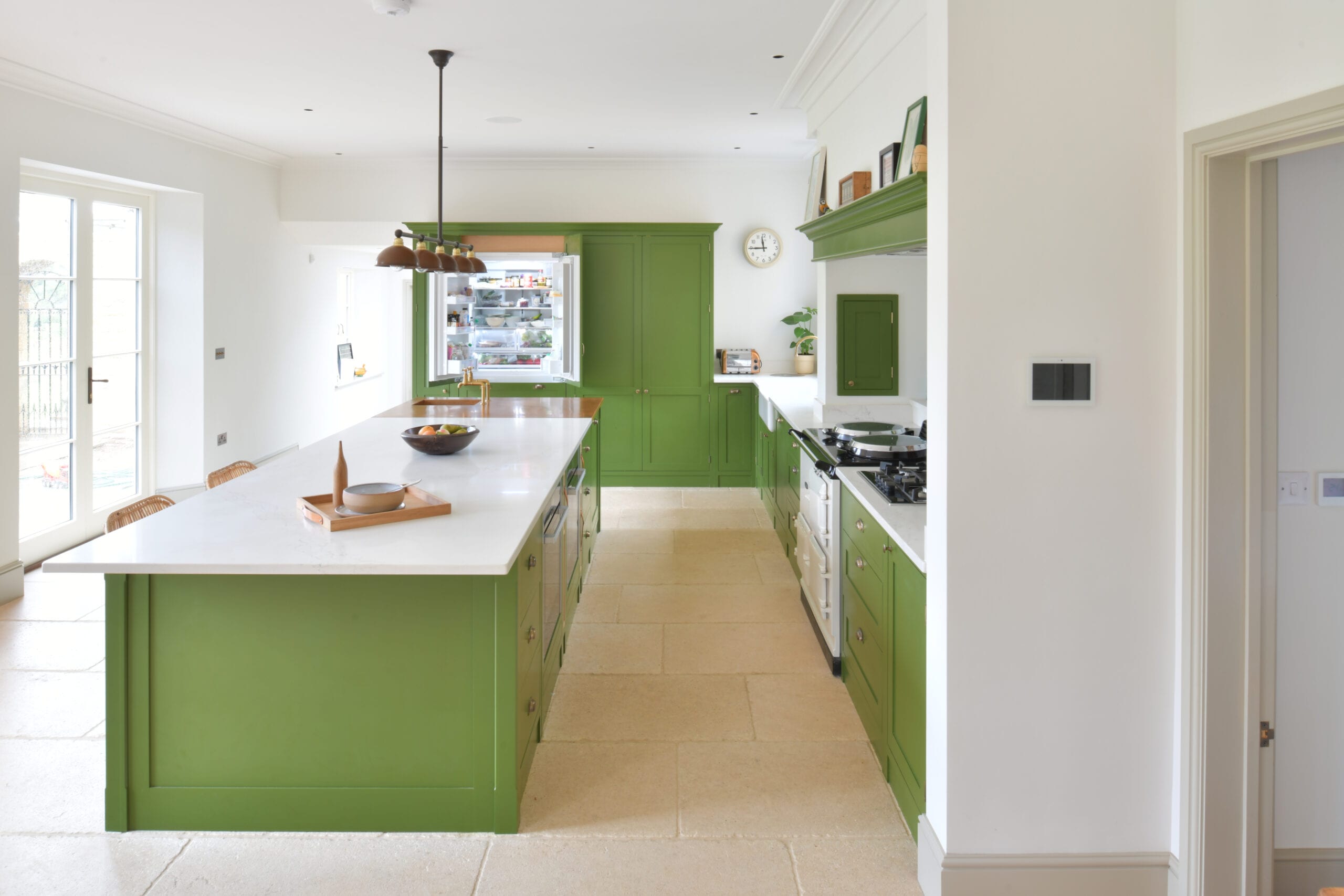 The space also features two oven Aga range cookers, in white vitreous enamel. The bold use of white is a feature throughout the space that keeps everything light and airy. The whitewashed walls, so reminiscent of a country kitchen, and the clean white granite work surfaces bounce light around the room, allowing the green and copper to dominate without being too dark and oppressive. This kitchen has been designed from the ground up, so the whole kitchen sits on a floor of traditional flagstones by Beswick Stone. It had to be stone, after all; this is the Cotswolds.