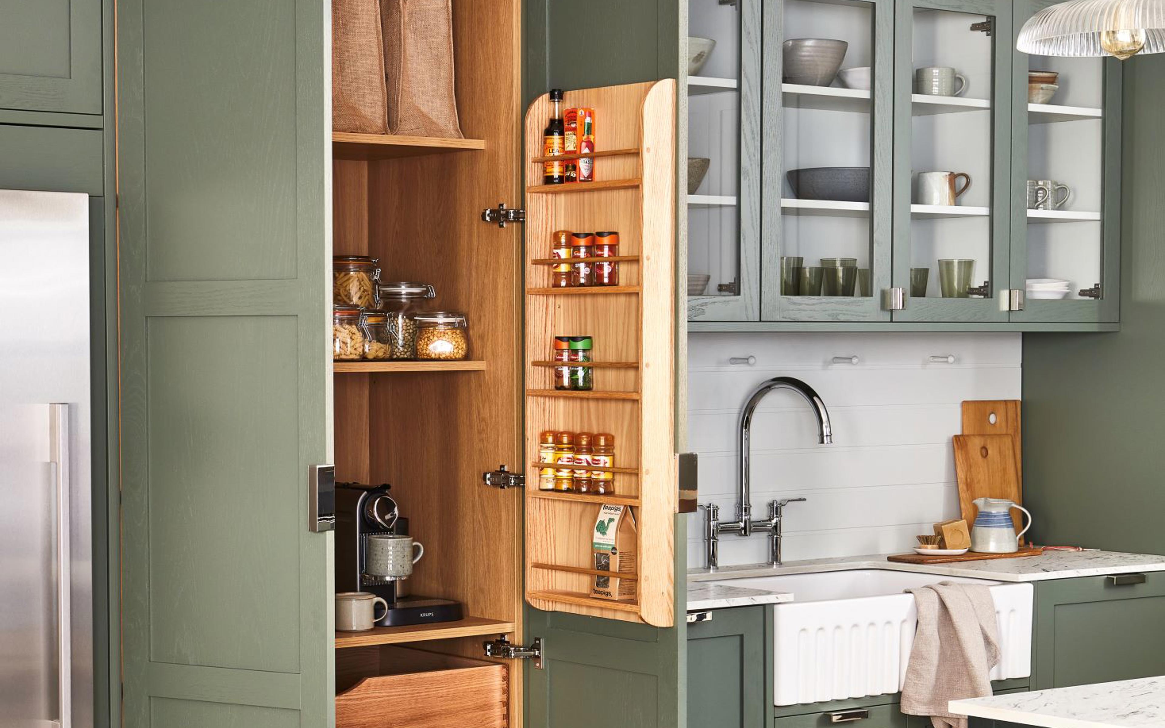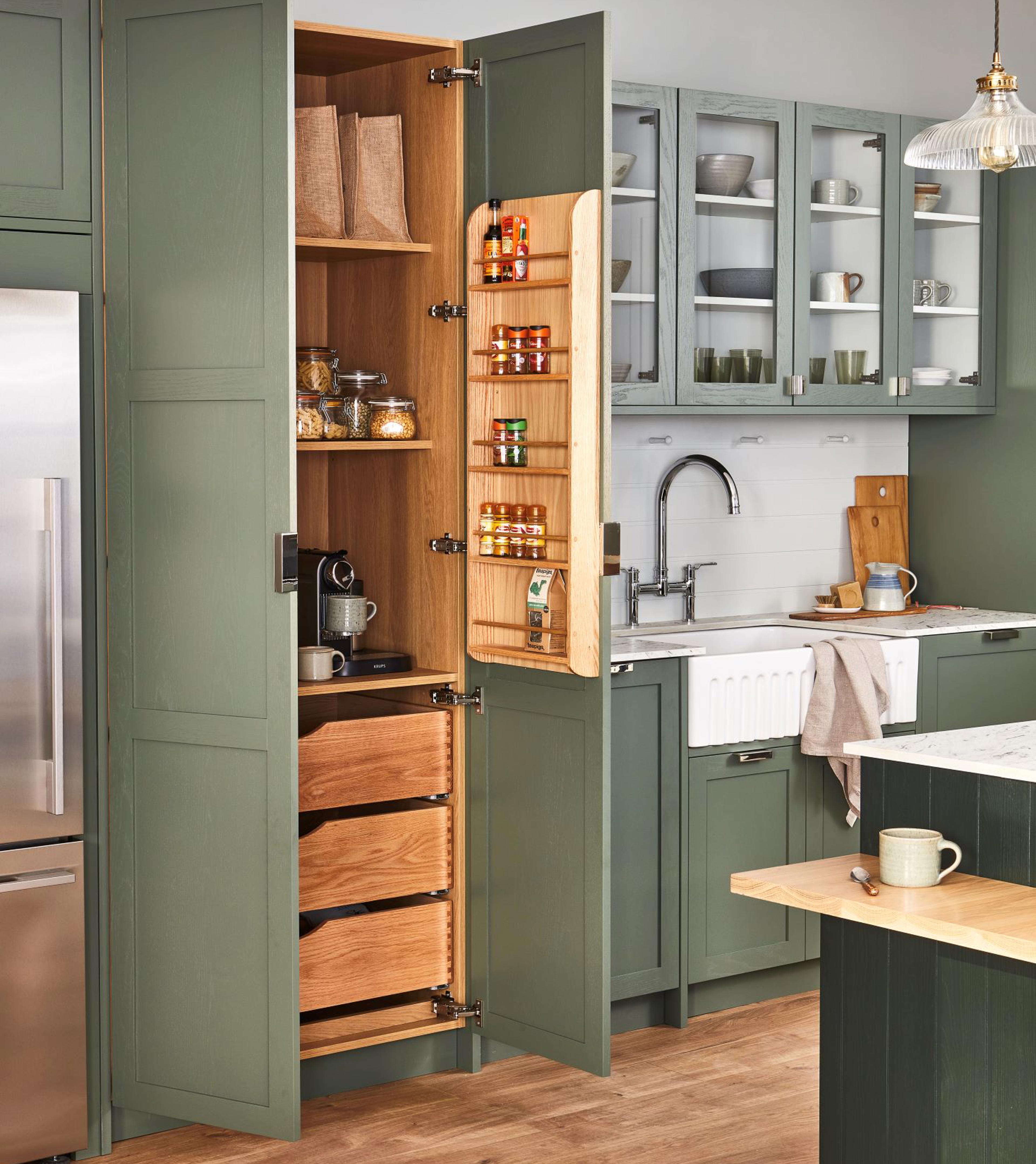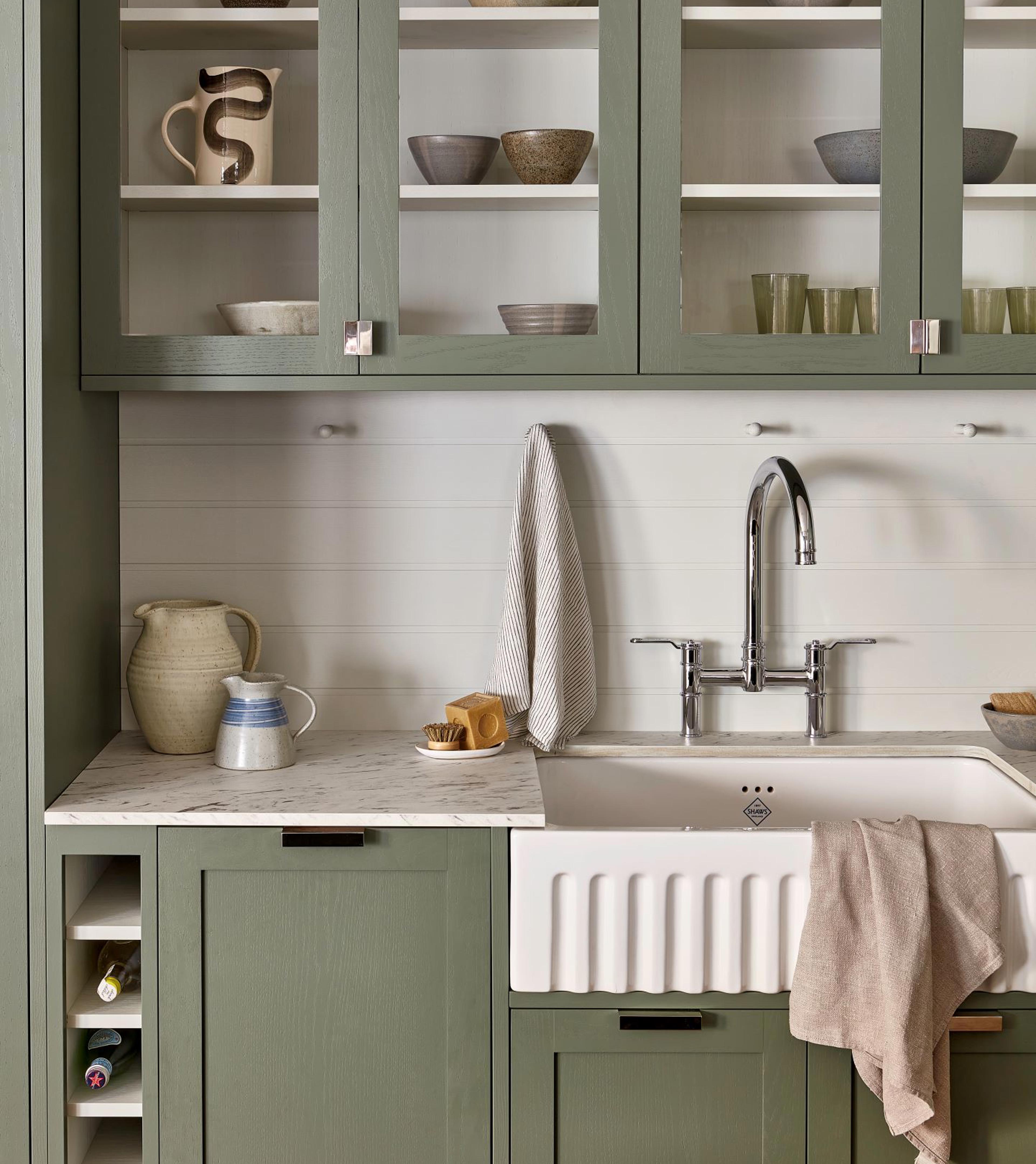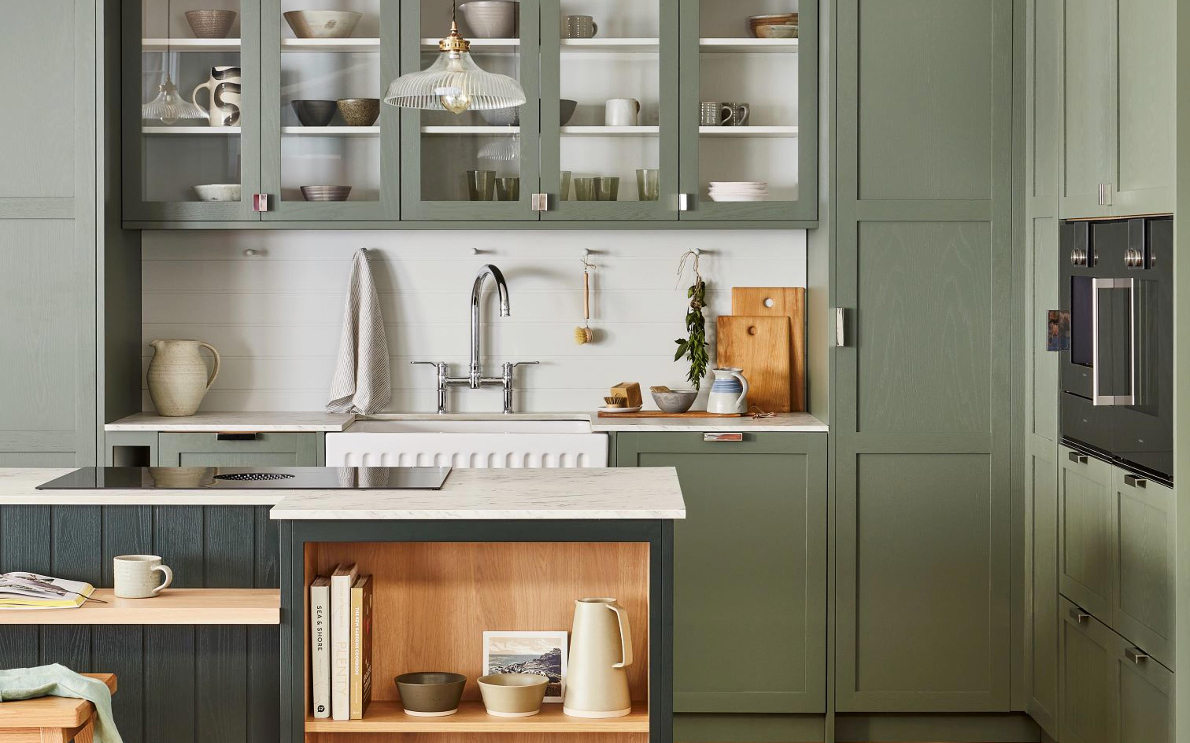 La cocina St Giles de Naked Kitchens, diseñadores de cocinas con sede en Norfolk, es un bello ejemplo de cocina Shaker contemporánea. Acabada en un trío de tonos verdes y con una barra de desayuno de roble, esta cocina es una clase magistral de cómo combinar el estilo tradicional con elementos modernos.