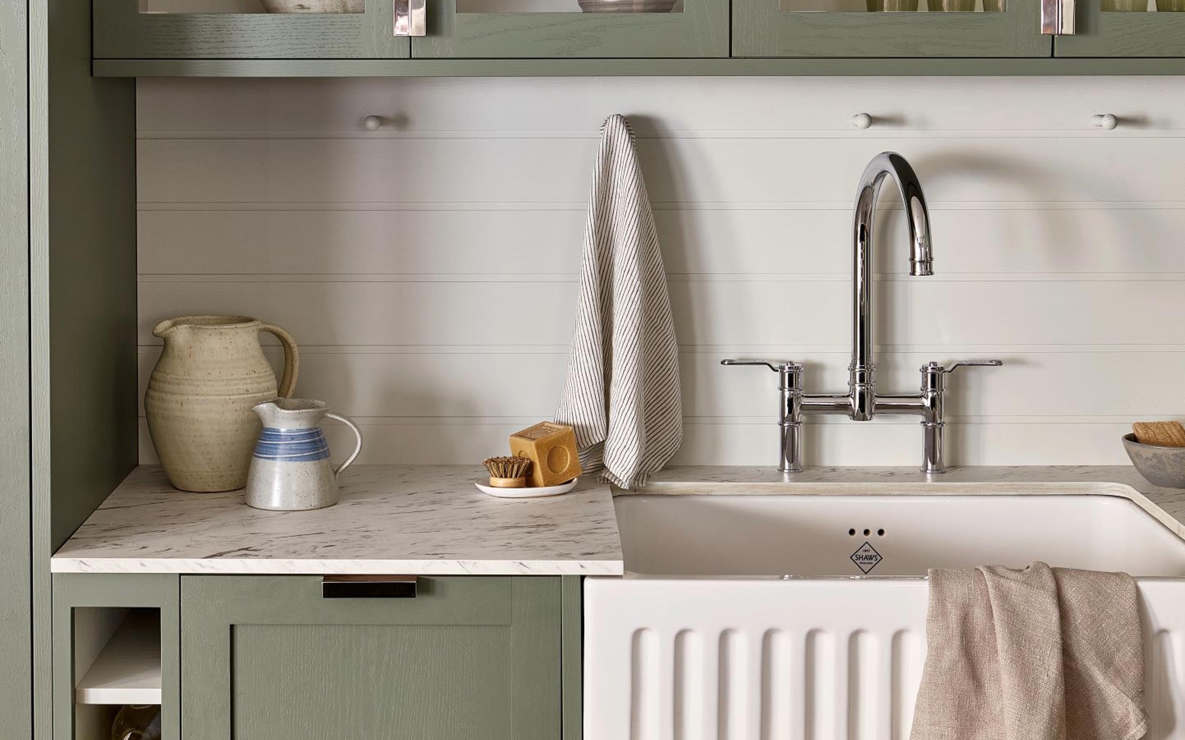 El fregadero Bowland 800 de Shaws of Darwen destaca por su frente estriado. Se combina con el mezclador de puente Armstrong en un moderno acabado de cromo pulido. De aspecto industrial, el Armstrong es un complemento divertido para esta cocina Shaker. Una gran despensa de roble ofrece mucho espacio de almacenamiento.