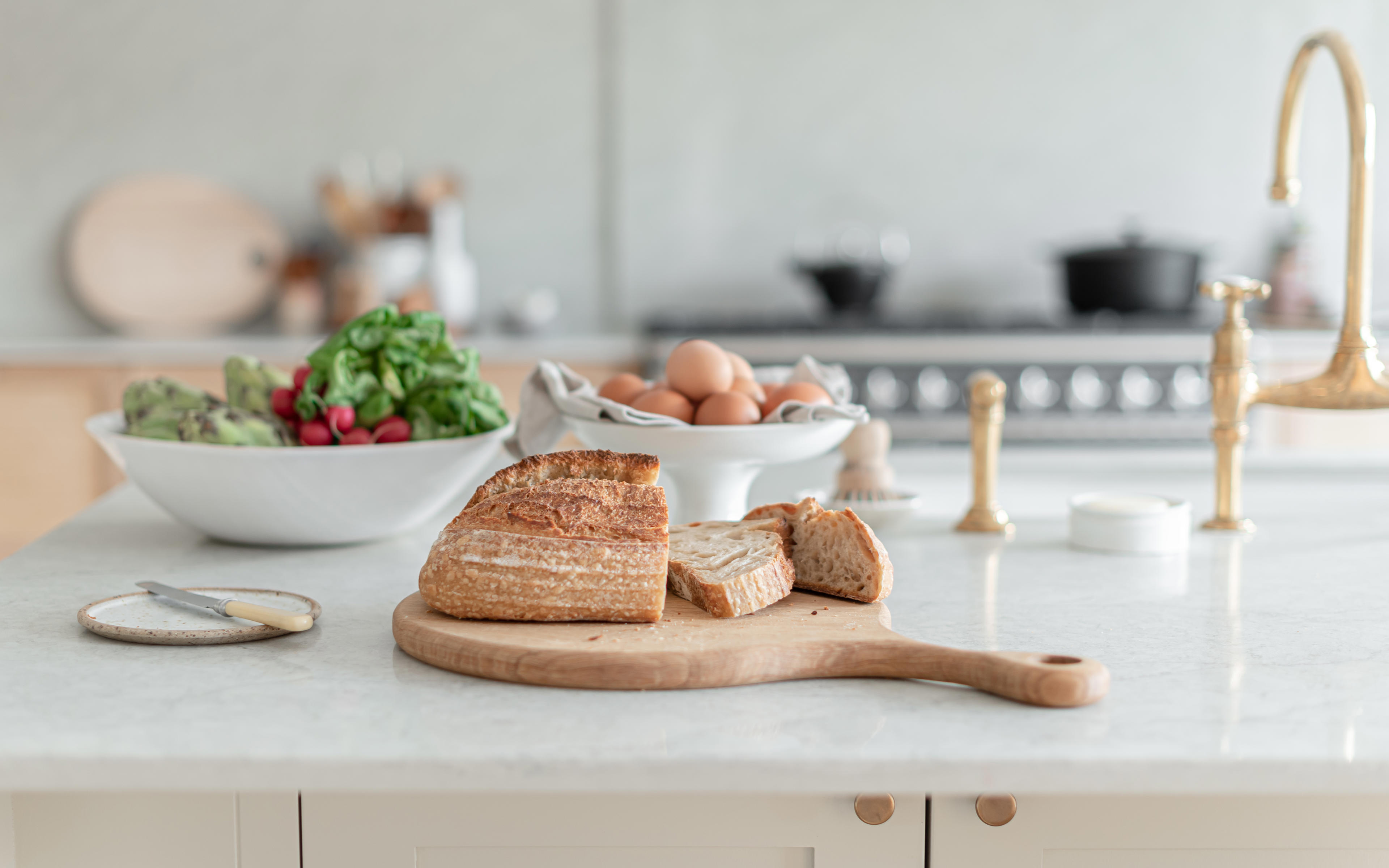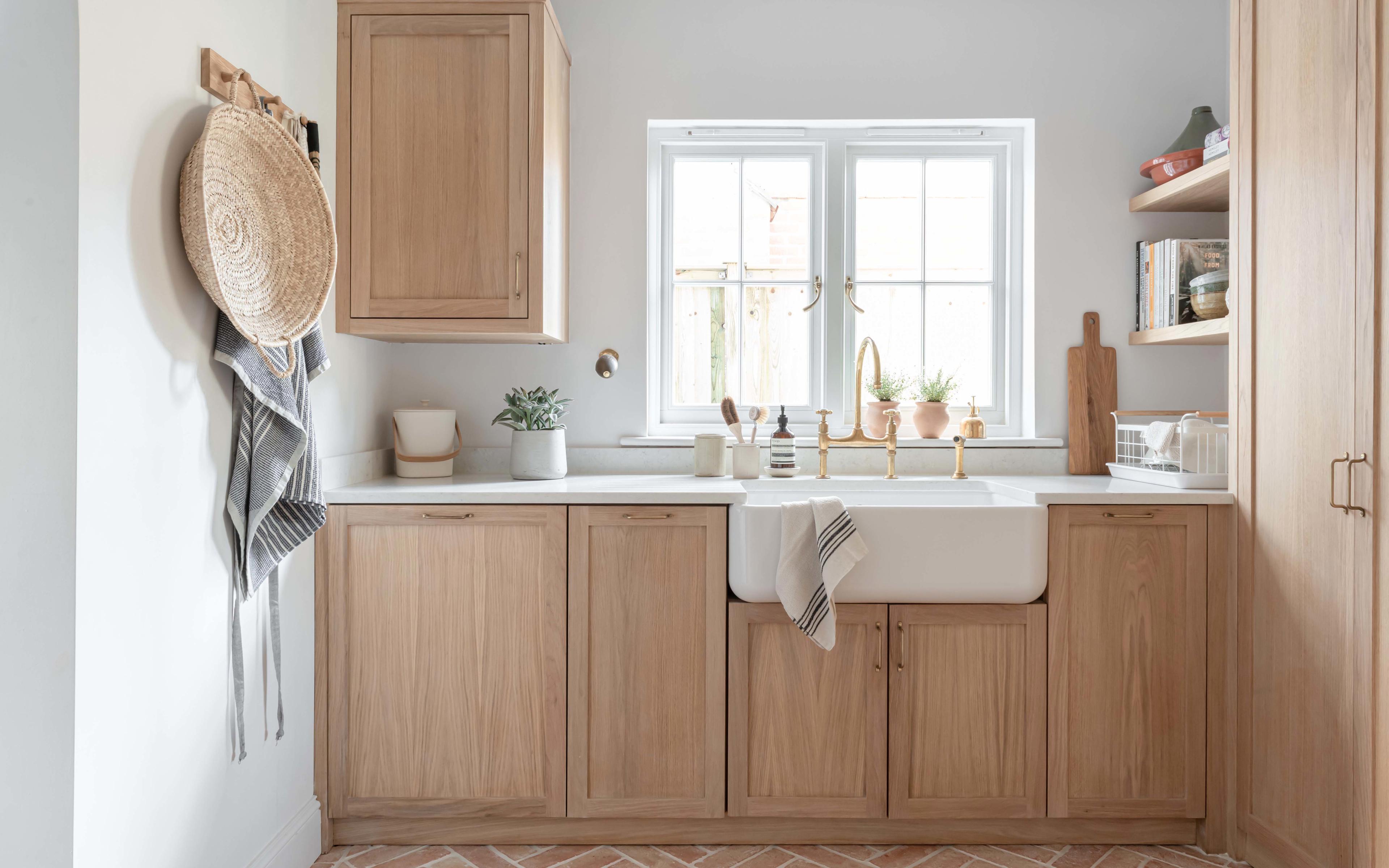 Belle a collaboré avec Shere Kitchens pour l'aider à concrétiser sa vision du réaménagement de la cuisine et de la buanderie. Le cahier des charges consistait à combiner la chaleur et la convivialité d'une cuisine anglaise traditionnelle avec la liberté d'une retraite côtière californienne, en mettant l'accent sur la beauté naturelle grâce à des armoires en chêne fabriquées à la main.