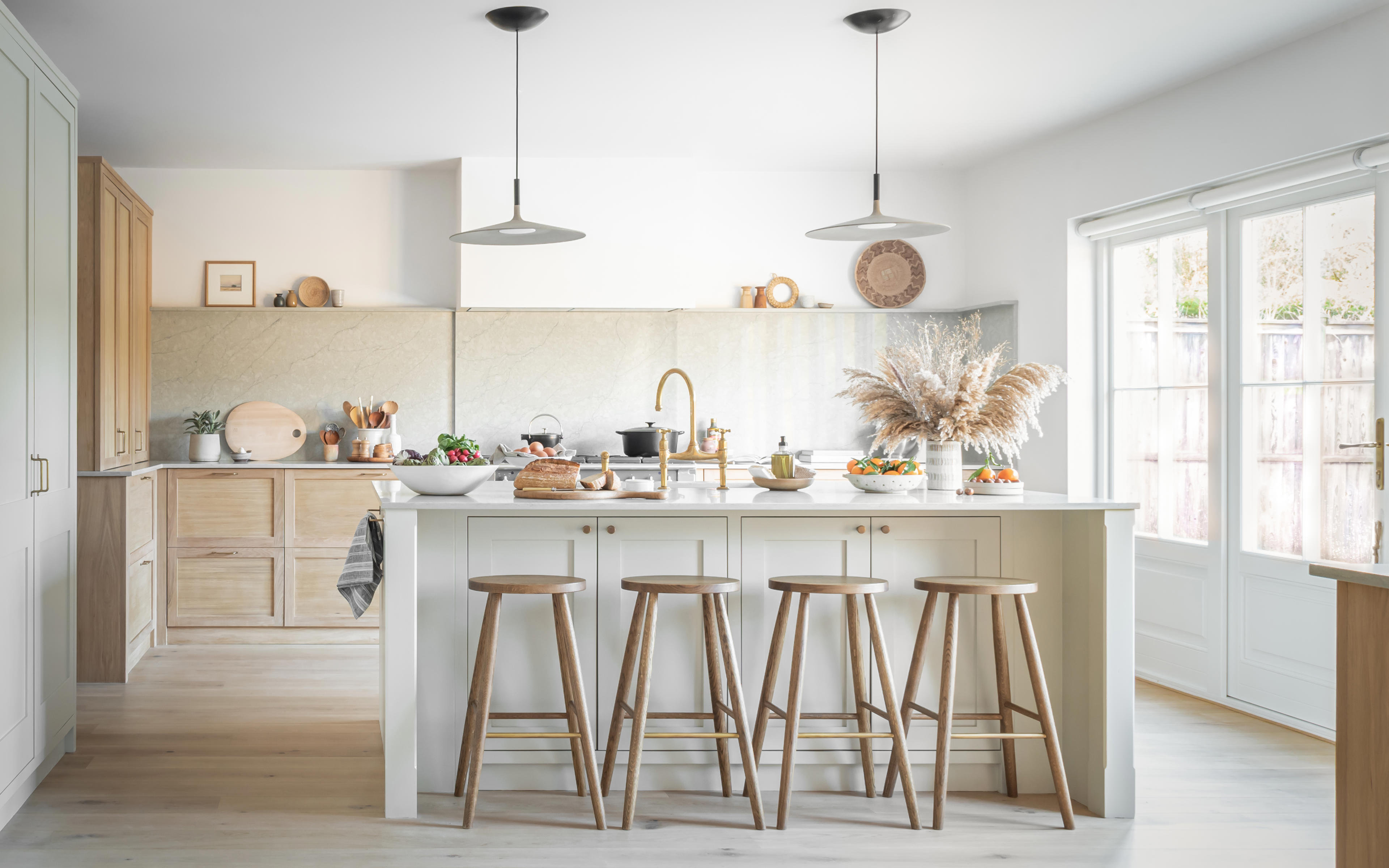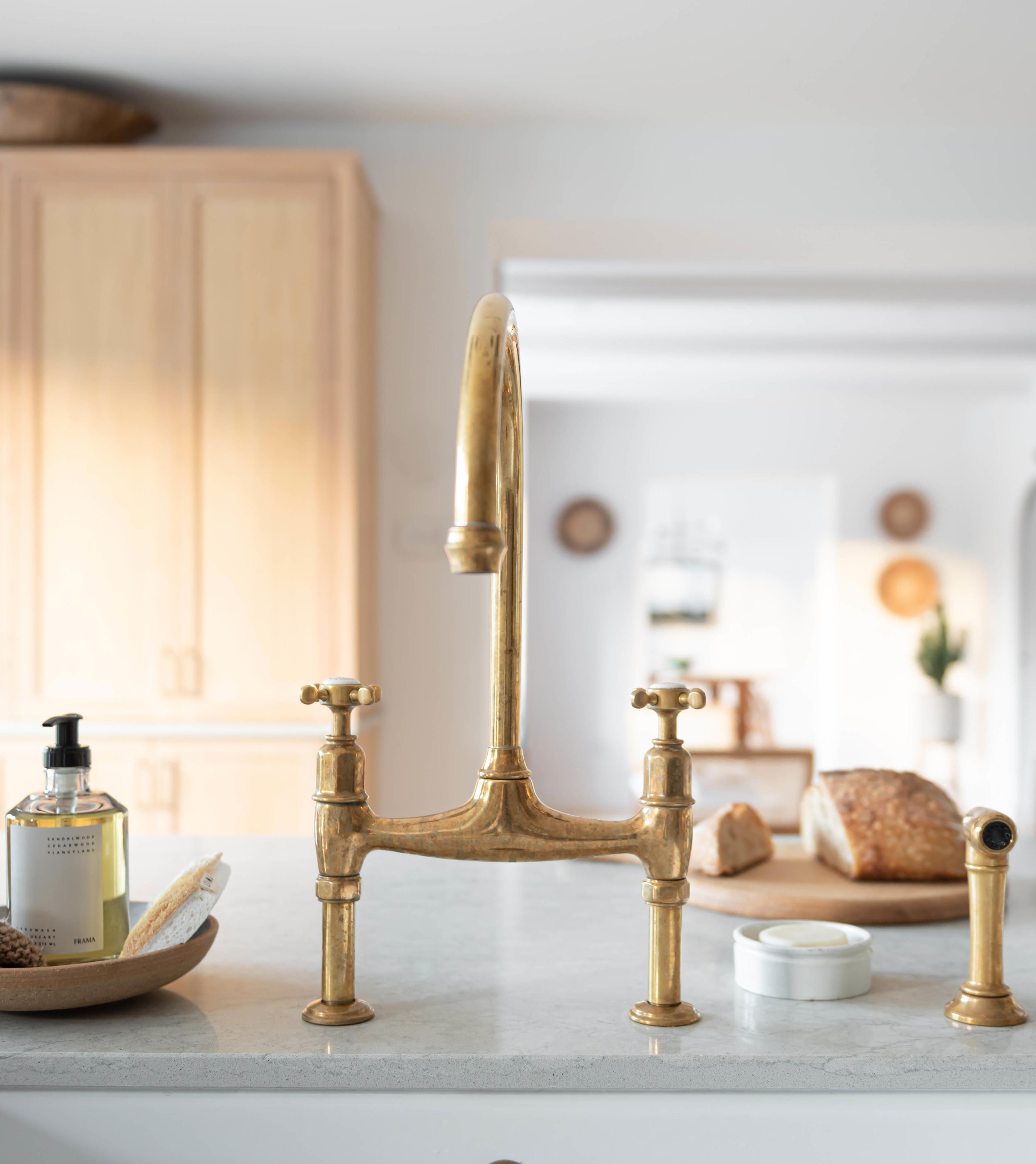 Les plans de travail en quartz gris pâle s'harmonisent parfaitement avec le bois clair et les accents de miel des poignées de robinets et d'armoires en laiton poli fabriquées à la main par Perrin & Rowe.