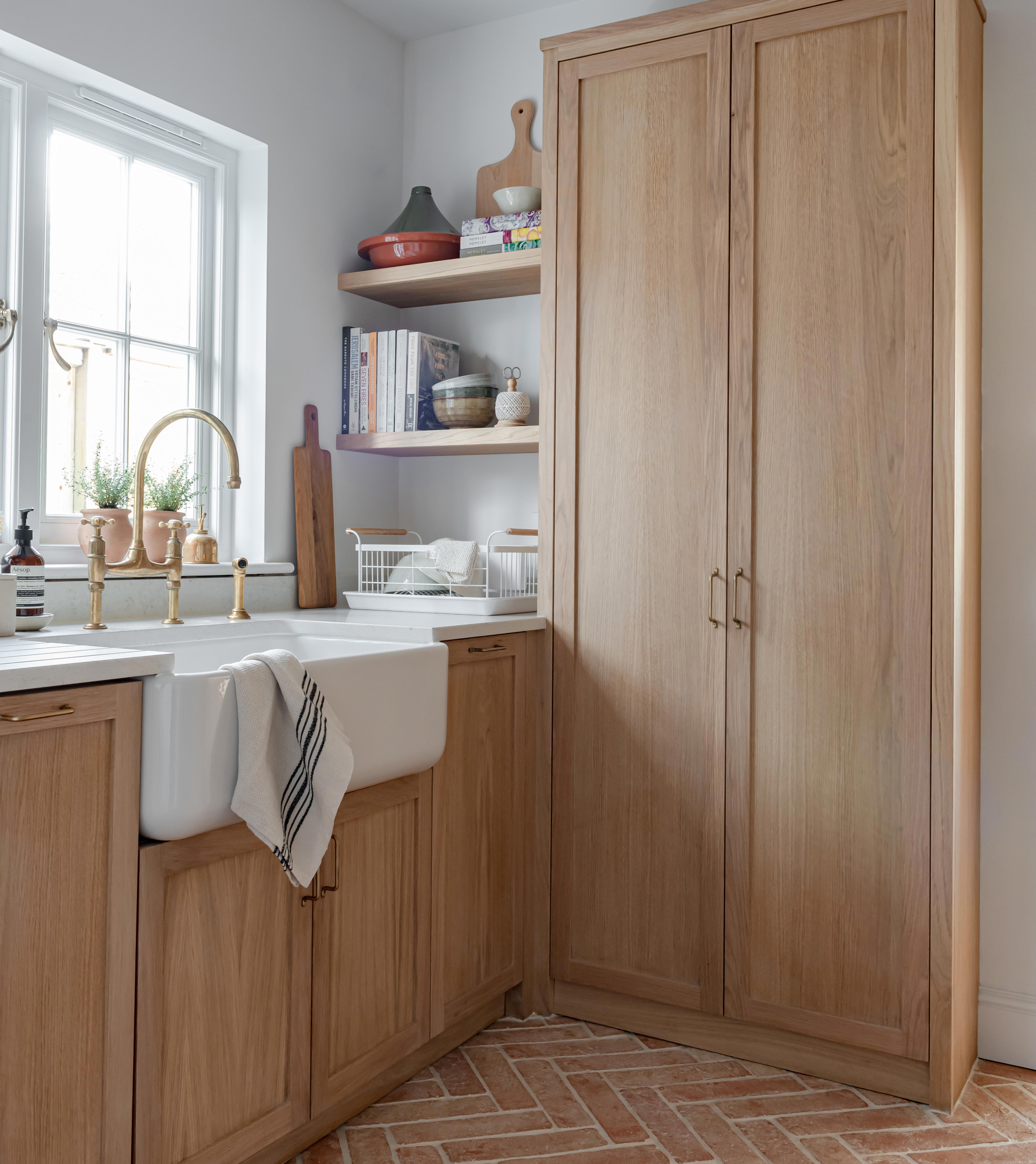 L'évier de la buanderie, un Butler 900 Shaws à tablier, est placé sous la fenêtre pour profiter au maximum de la lumière naturelle. Pour ne pas encombrer la cuisine principale, la famille utilise souvent cet évier pour laver les grosses pièces comme les plateaux de rôtissage, et c'est l'endroit idéal pour empiler les assiettes sales à l'abri des regards lors des réceptions. L'espace utilitaire est doté d'un magnifique sol en briques de terre cuite à motifs en chevrons, dont la texture et la chaleur confèrent un véritable caractère à la pièce.