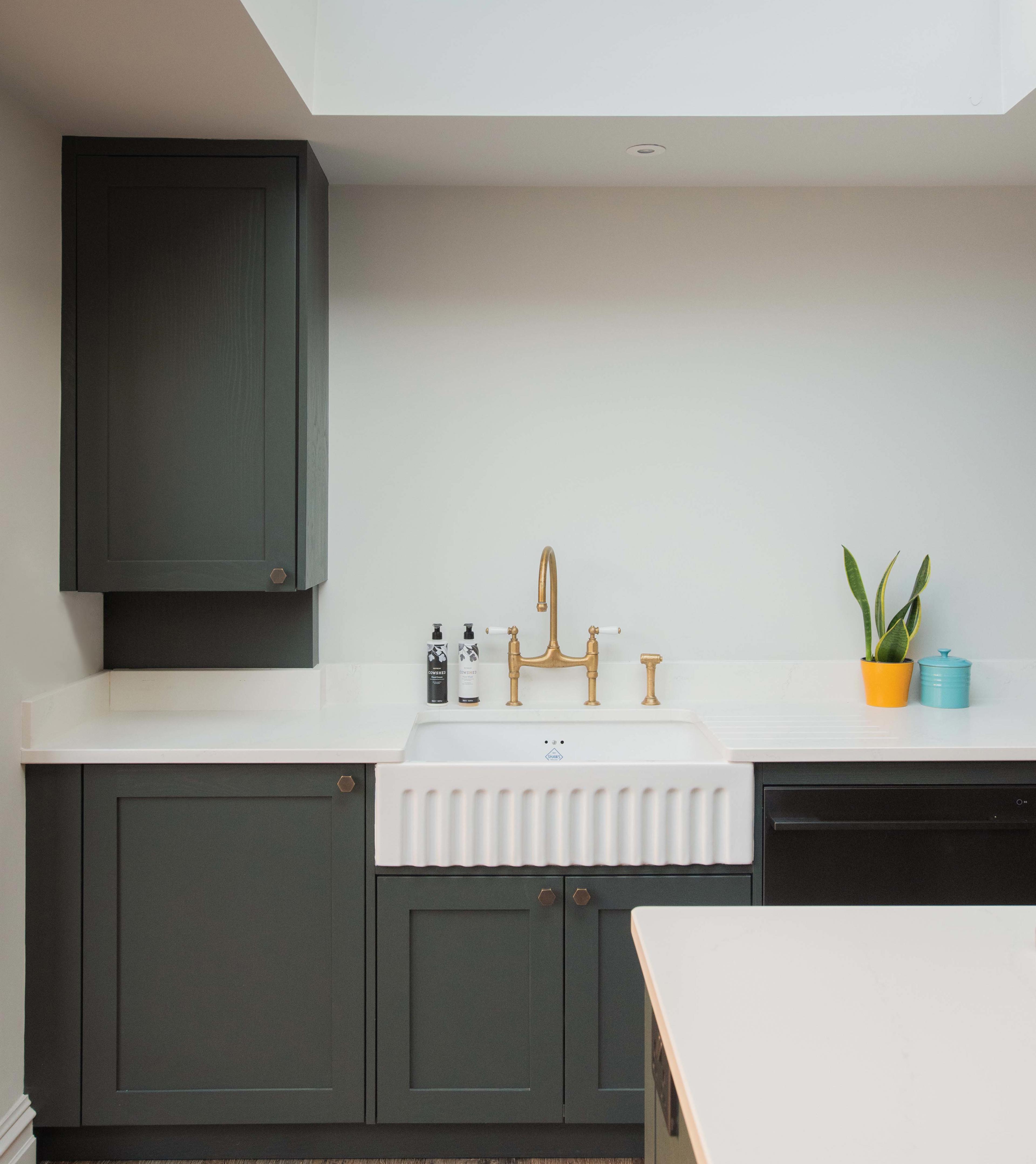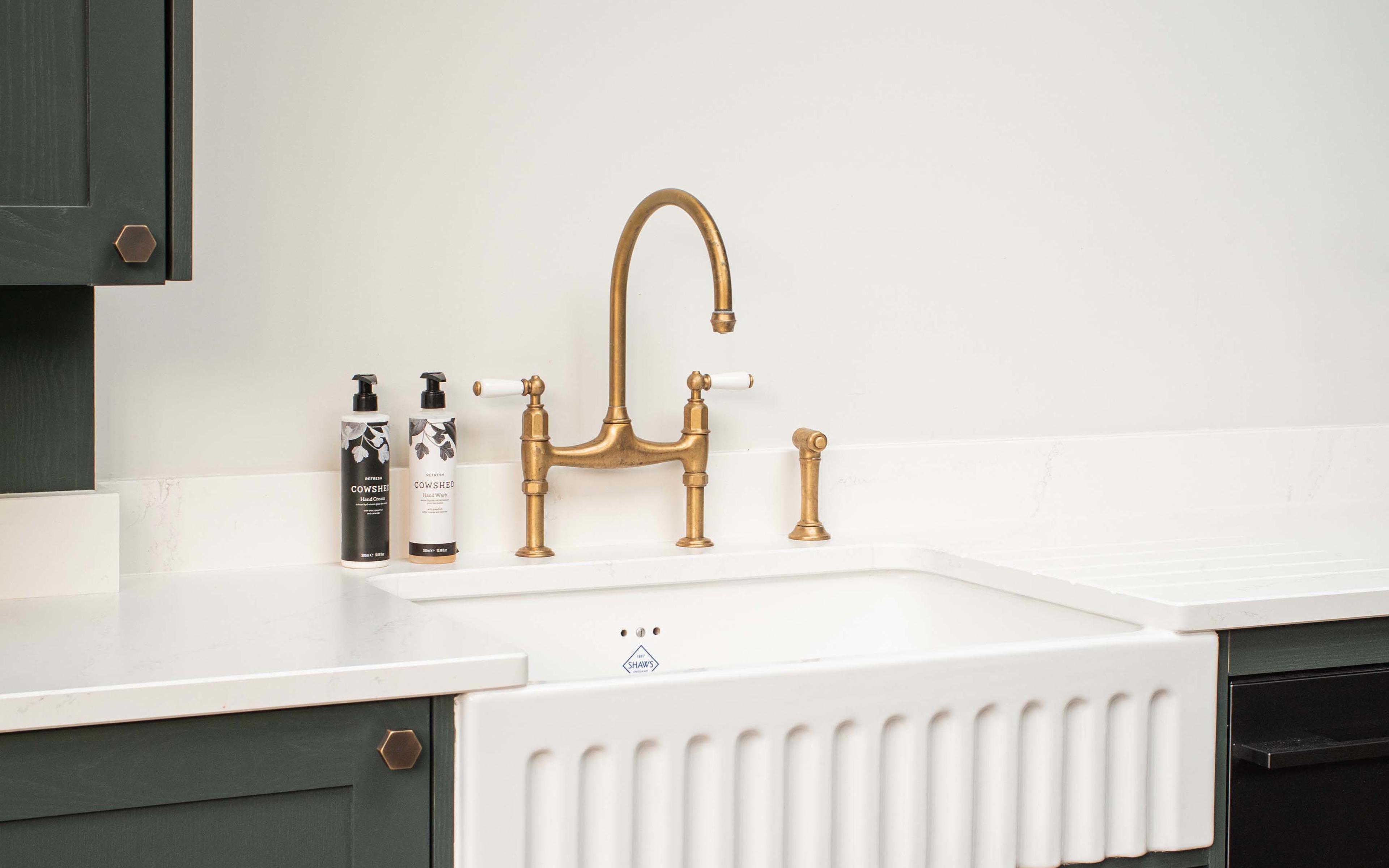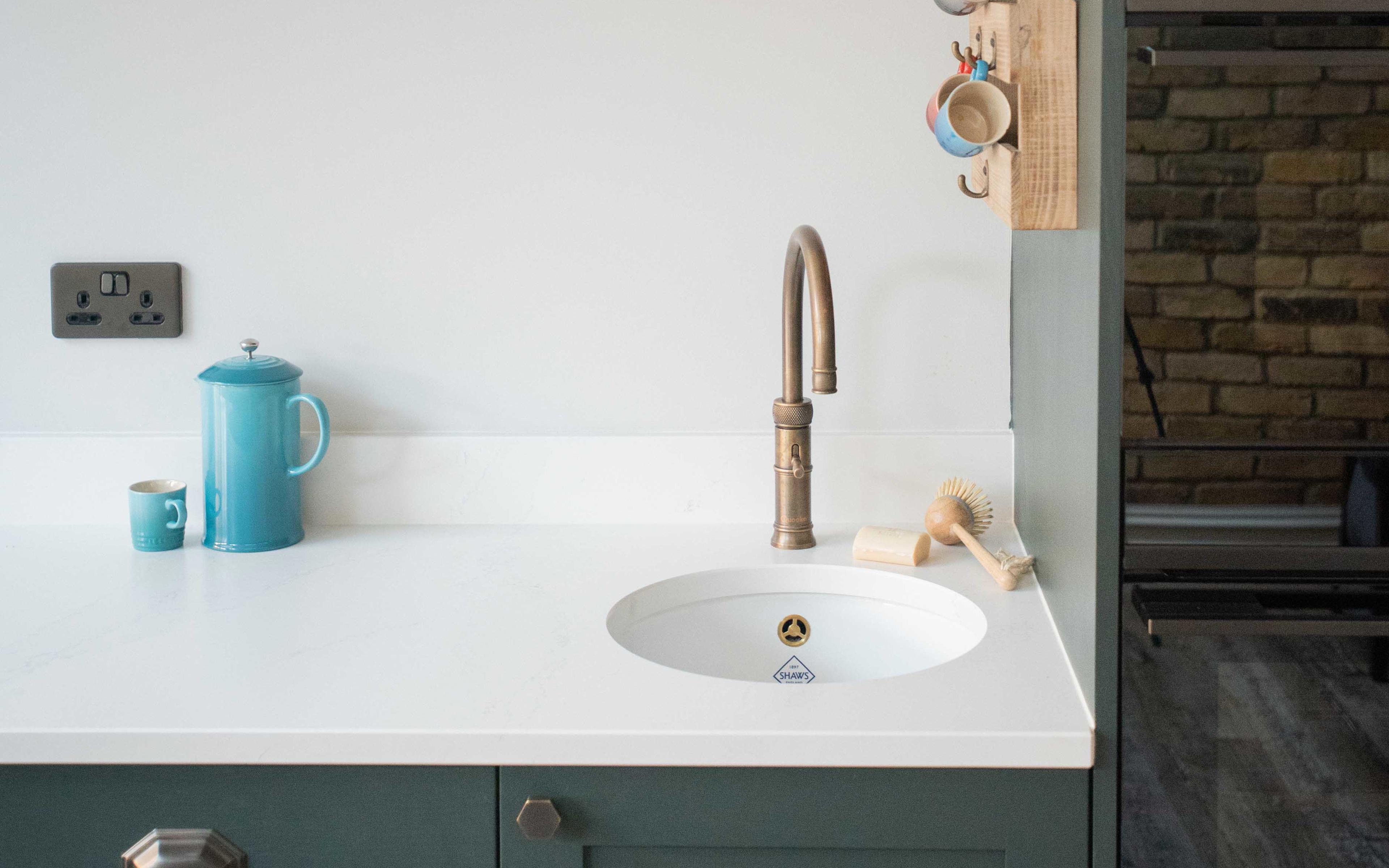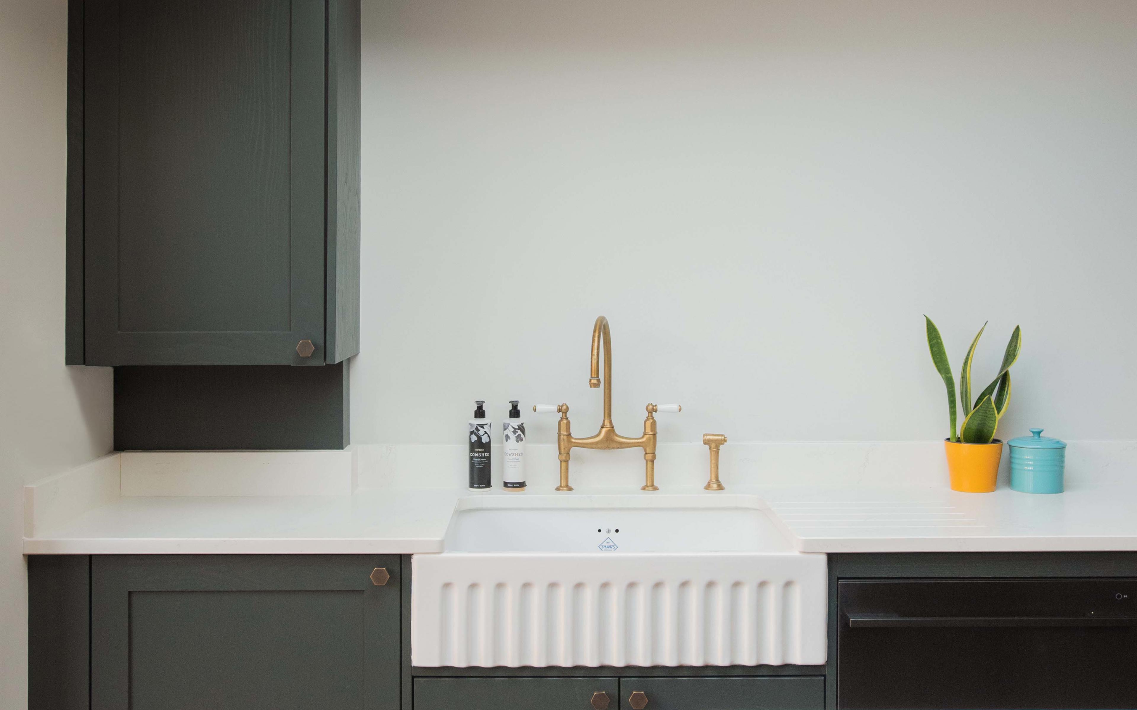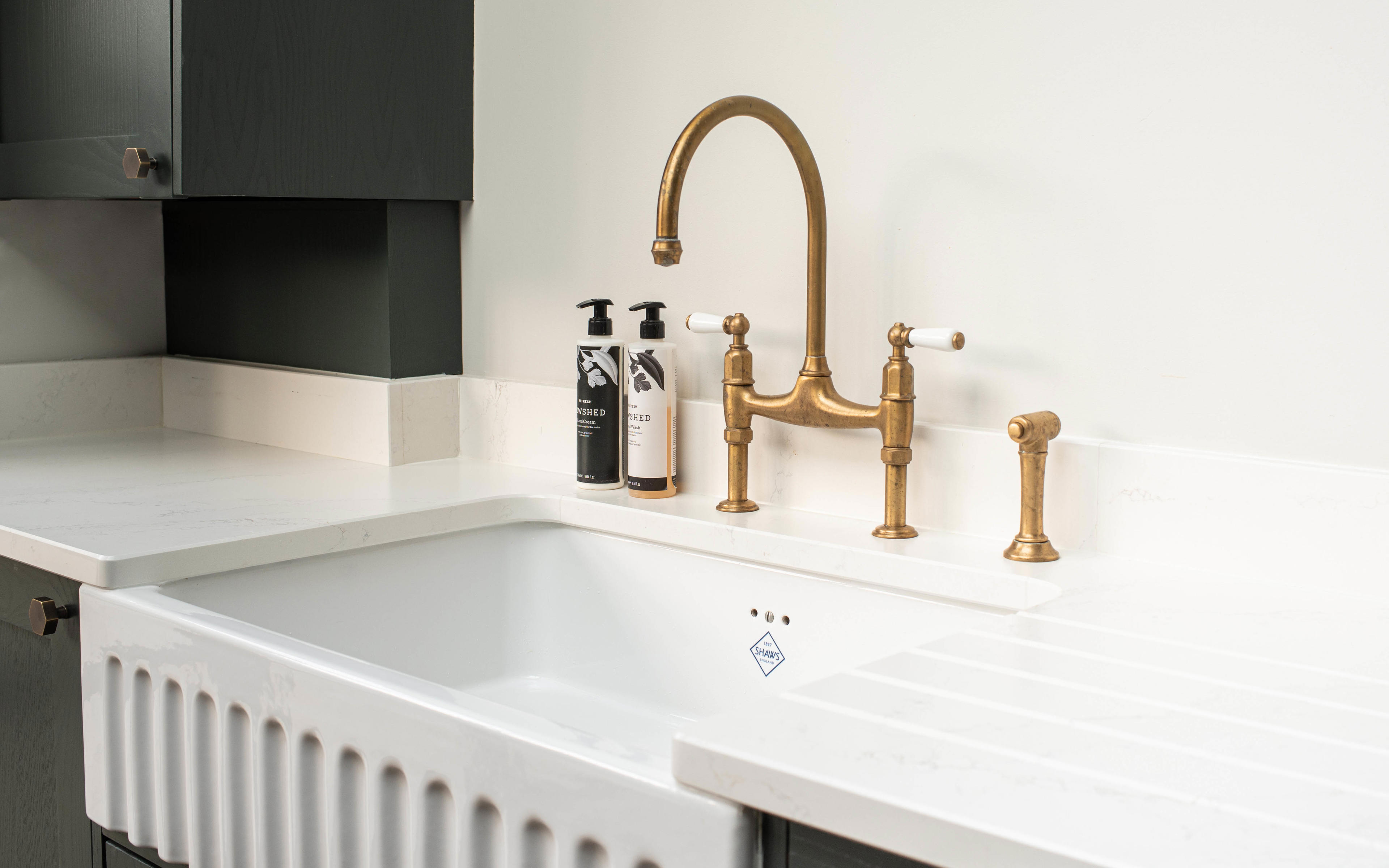 L'évier Bowland 800 à façade cannelée est placé le plus à gauche possible sur le plan de travail, à côté du mitigeur Perrin & Rowe Ionian bridge avec un jet de rinçage latéral - une autre exigence de Penny.Le robinet et le rince-bouche sont en finition laiton satiné, qui s'harmonise parfaitement avec les meubles de cuisine vert foncé.Penny souhaitait disposer d'un plan de travail aussi long que possible et ne voulait pas qu'il soit interrompu par un évier au milieu. L'évier secondaire est un Shaws Round, l'un des plus petits éviers de Shaws, ce qui en fait une option parfaite.Dans ce cas, il était idéal de l'associer à un robinet d'eau chaude instantanée.